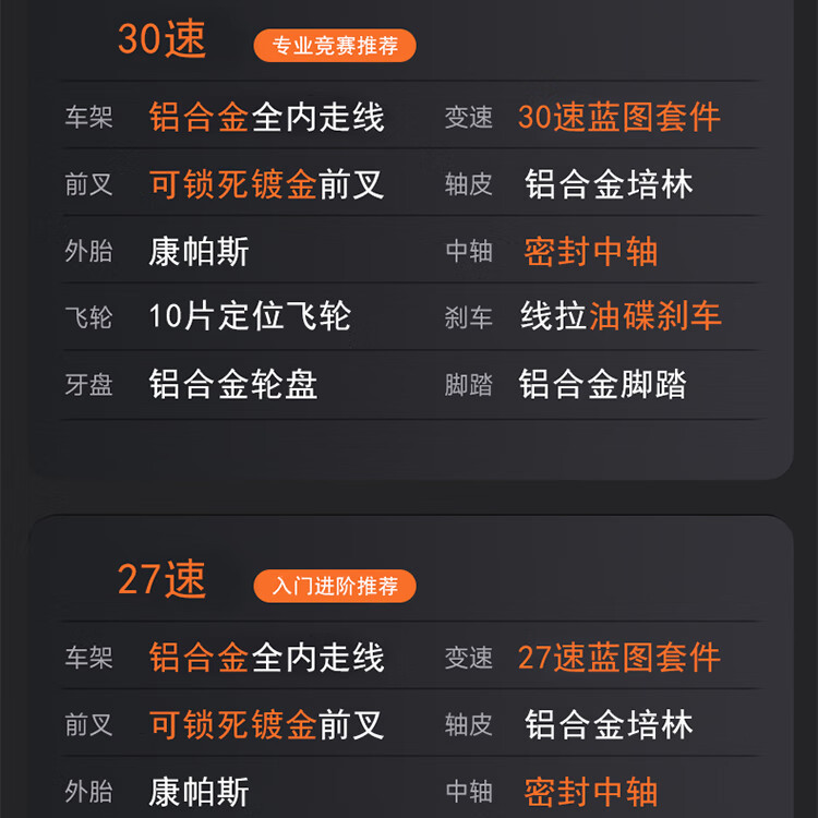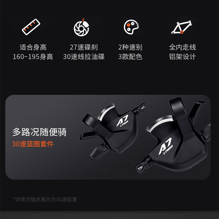 | Colores | Freno de disco de 27 velocidades (naranja fuego),Freno de disco de 27 velocidades (gris avanzado),Freno de disco de 27 velocidades (blanco perla),Disco de aceite de 30 velocidades (naranja fuego),Disco de aceite de 30 velocidades (gris premium),Disco de aceite de 30 velocidades (blanco perla) |