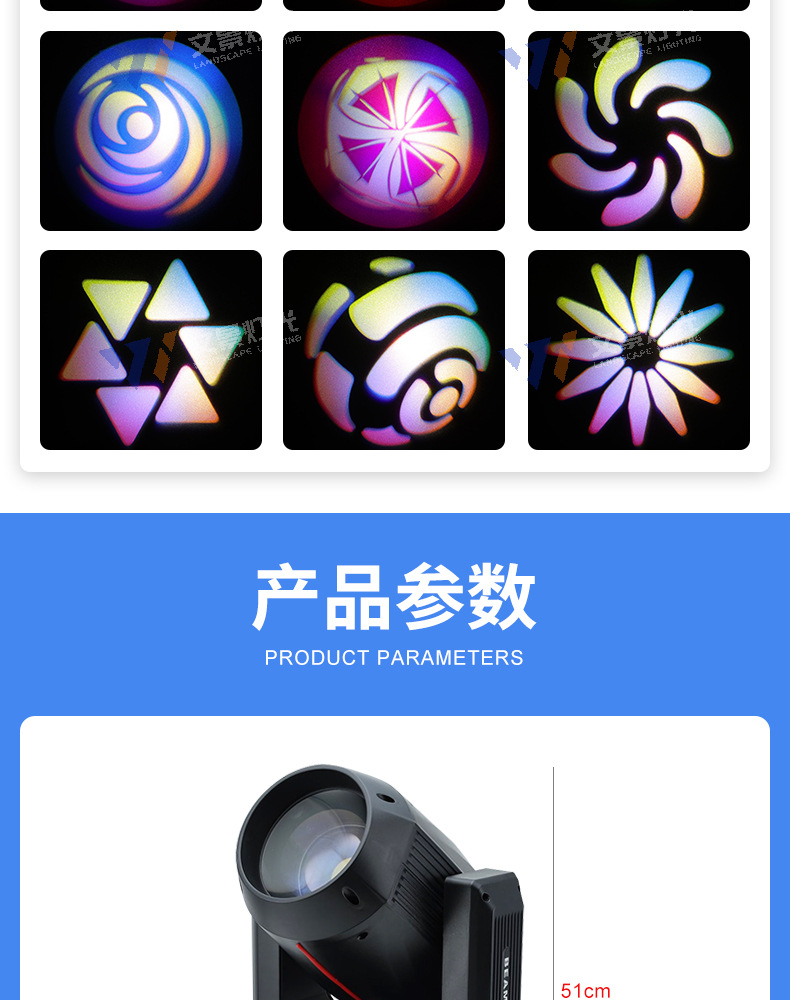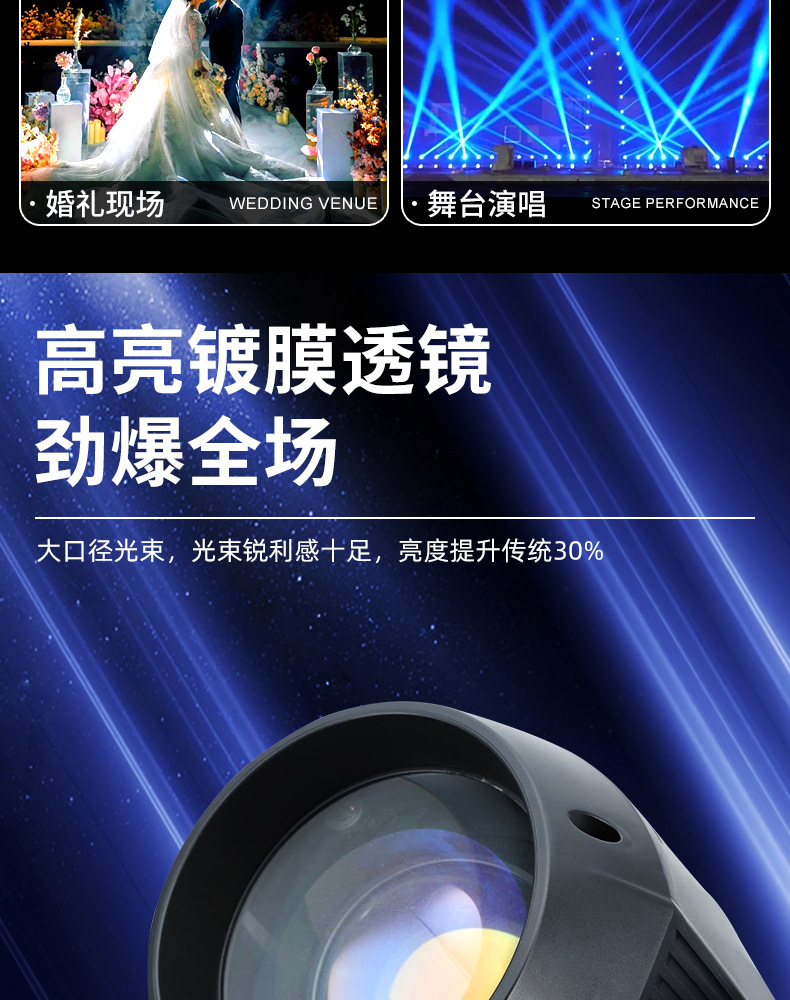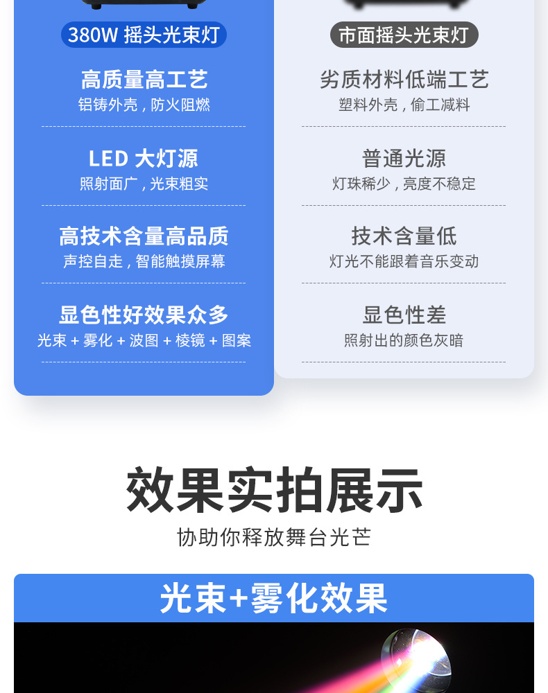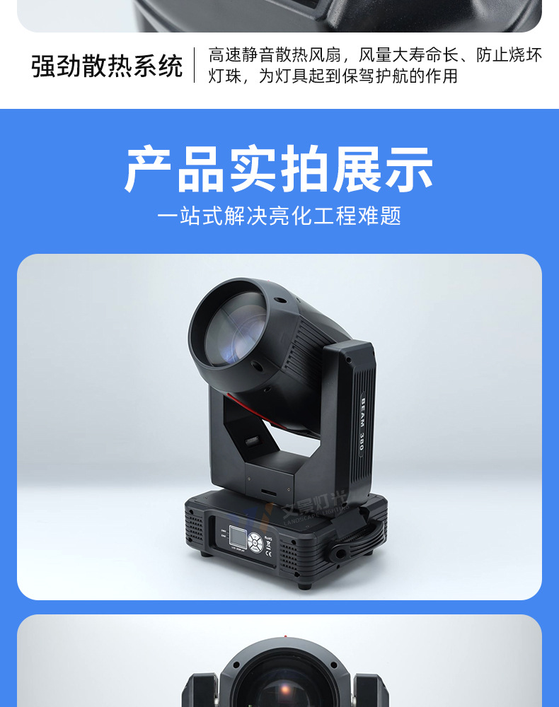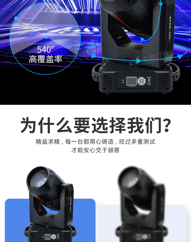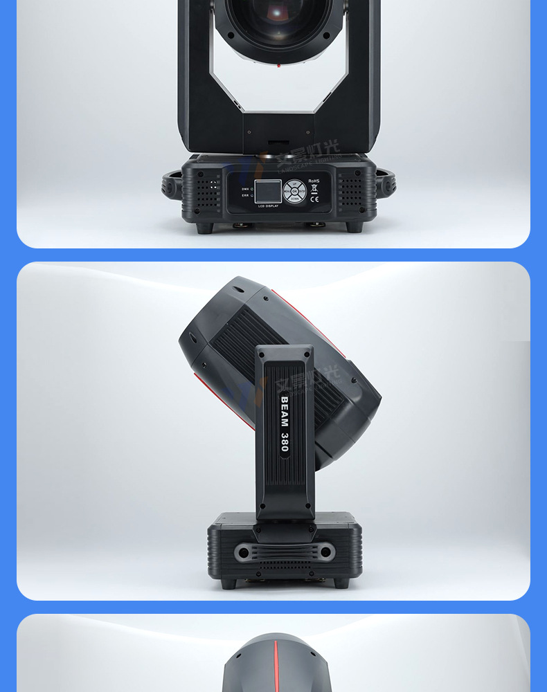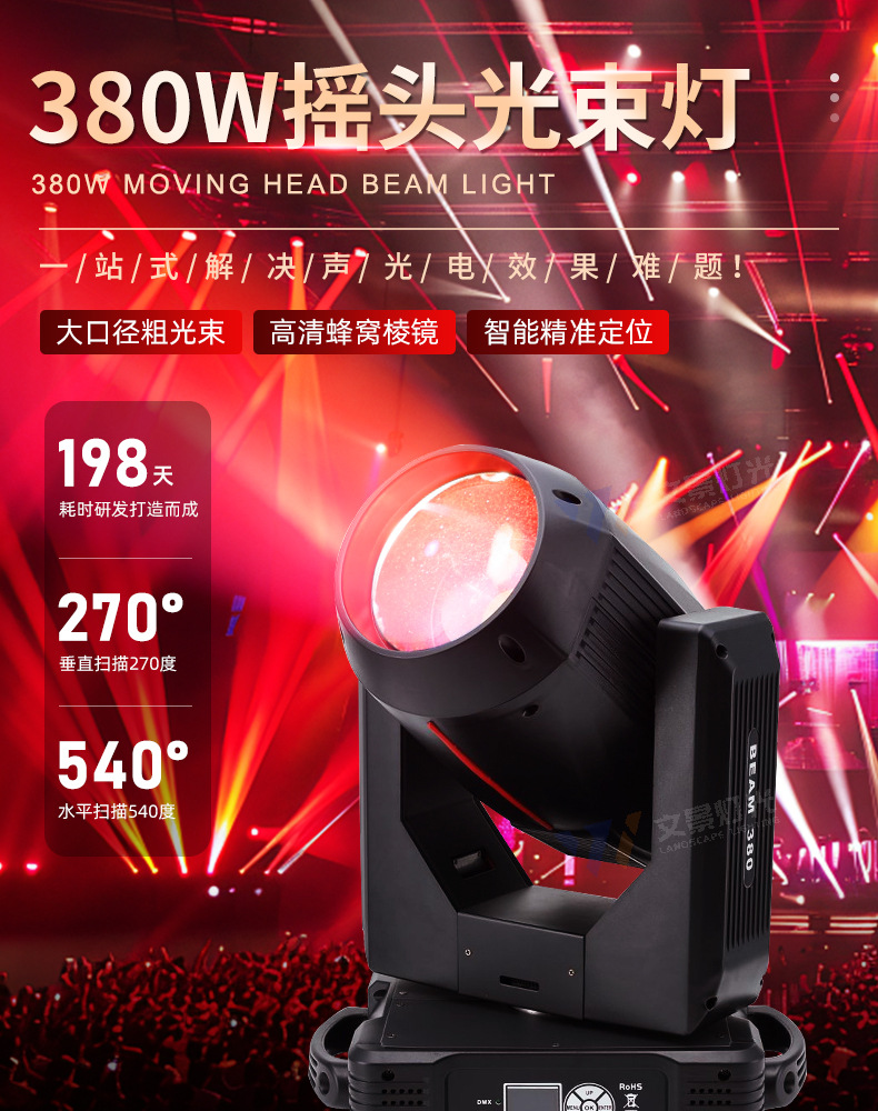 Sacudiendo la cabeza en el escenario, luz de haz de luz de 380w, equipo de iluminación de rendimiento de boda, conjunto completo de foco de barra de agitación lenta, patrón giratorio
