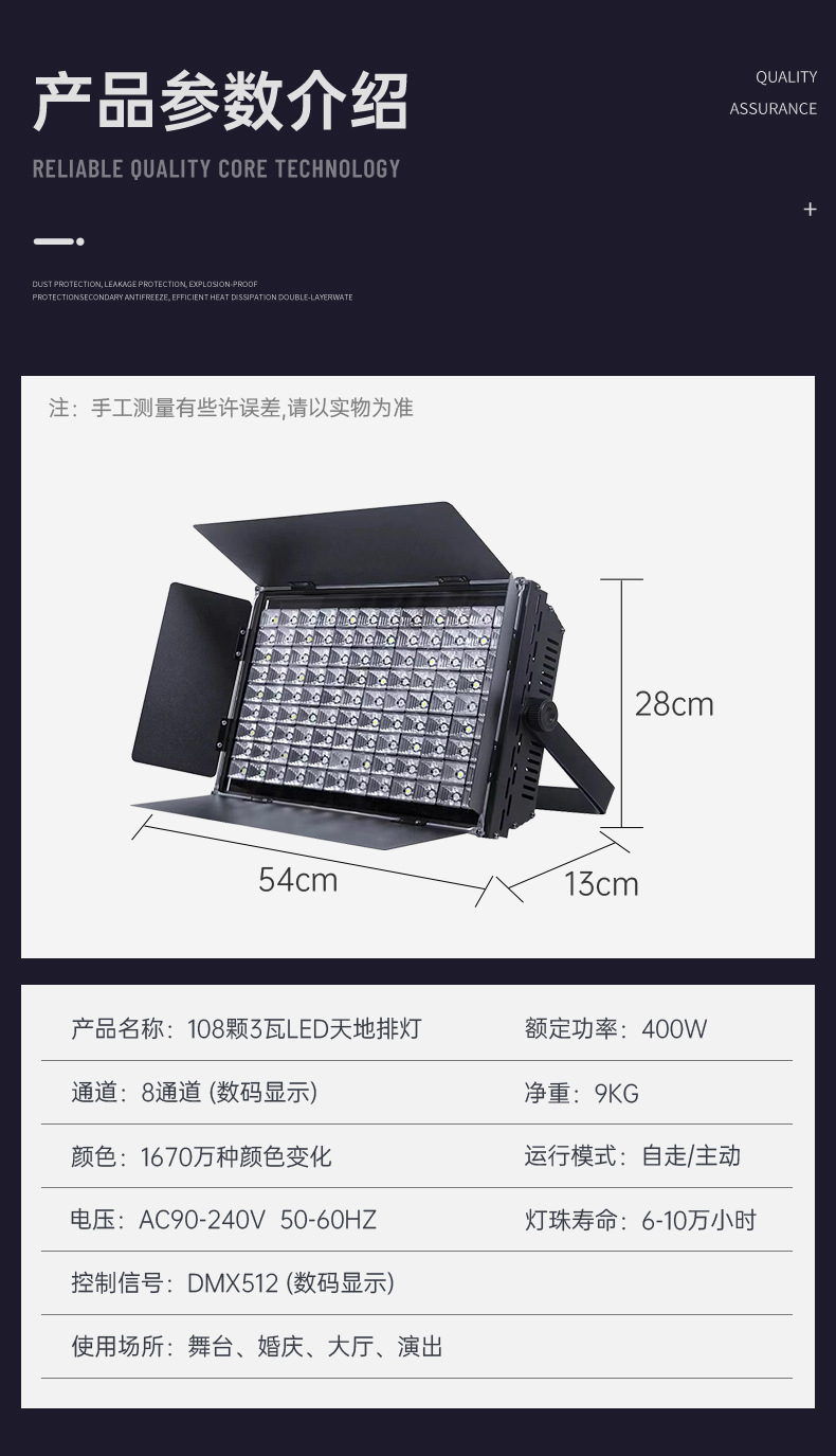 | Potencia de la fuente de luz | 108 filas de cielo y tierra de 3 vatios (teñido de colores), 108 filas de cielo y tierra de 3 vatios (luz de cara bicolor), 108 filas de cielo y tierra de 3 vatios (luz de cara blanca positiva), 108 filas de cielo y tierra de 3 vatios (luz de cara de color cálido) |