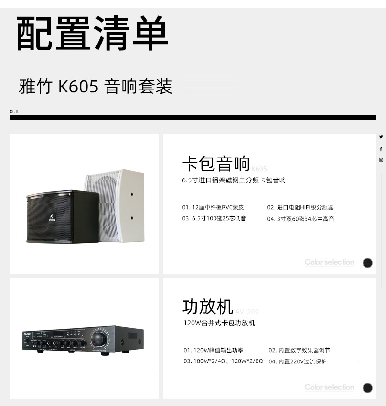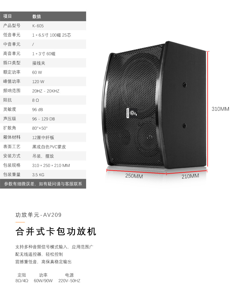 | Modelo | Un par de paquetes de tarjetas de 6 pulgadas y amplificadores de potencia de 1200w, un par de cajas profesionales de 8 pulgadas y amplificadores de potencia de 500w, un par de paquetes de tarjetas de 8 pulgadas y amplificadores de potencia de 300w, y una lista de sonido de paquetes de tarjetas de 8 pulgadas. |