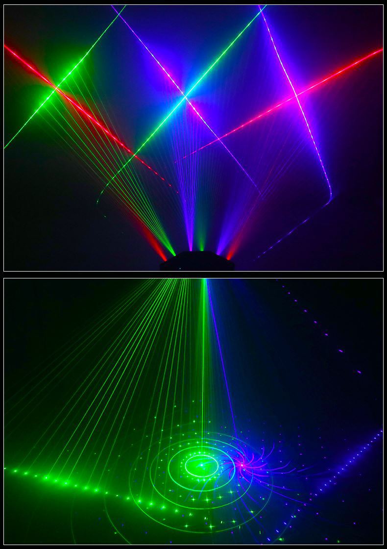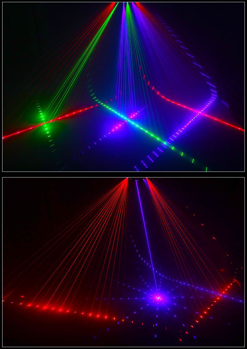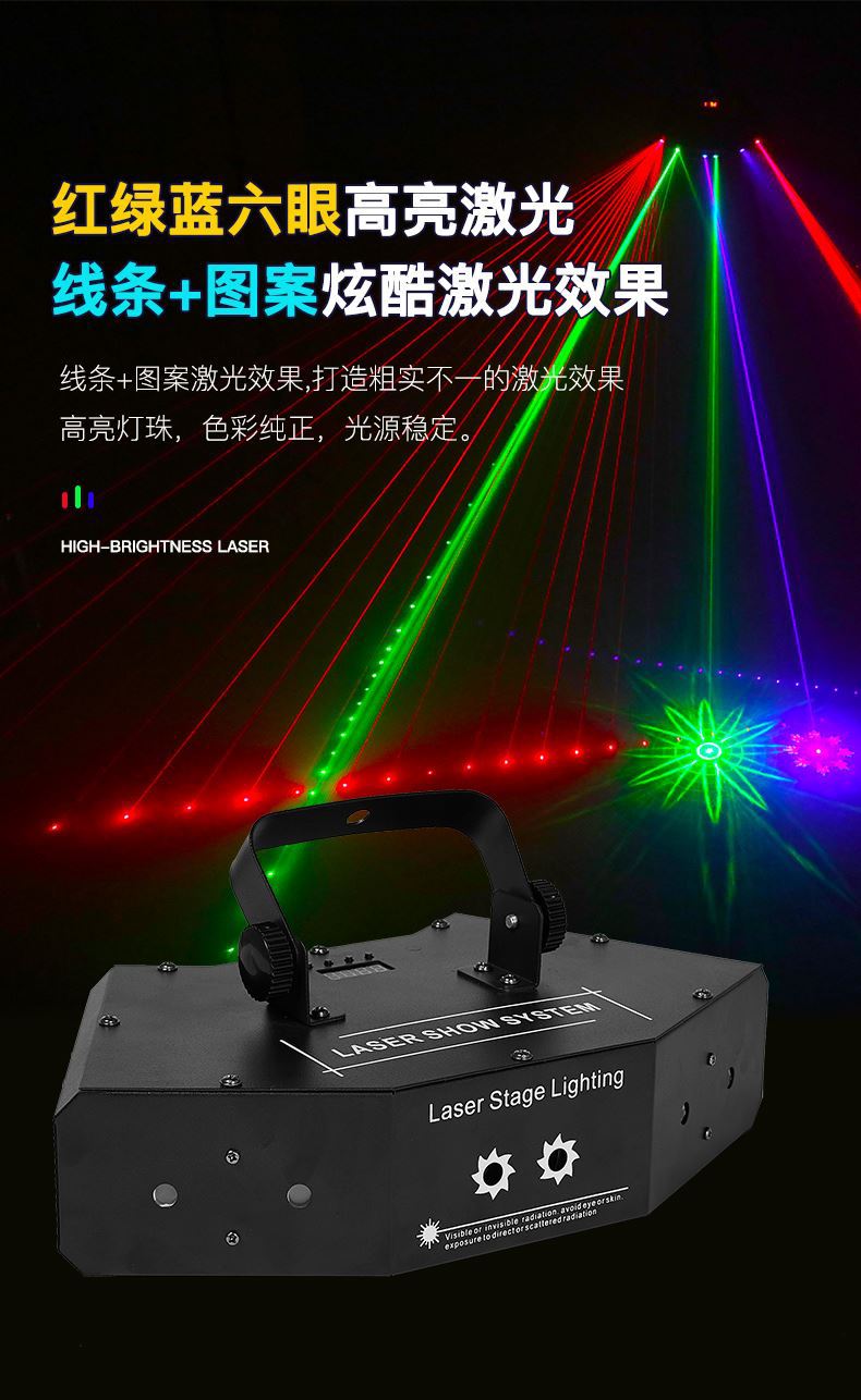Luz láser de escaneo de seis ojos rojo, verde y azul + patrón