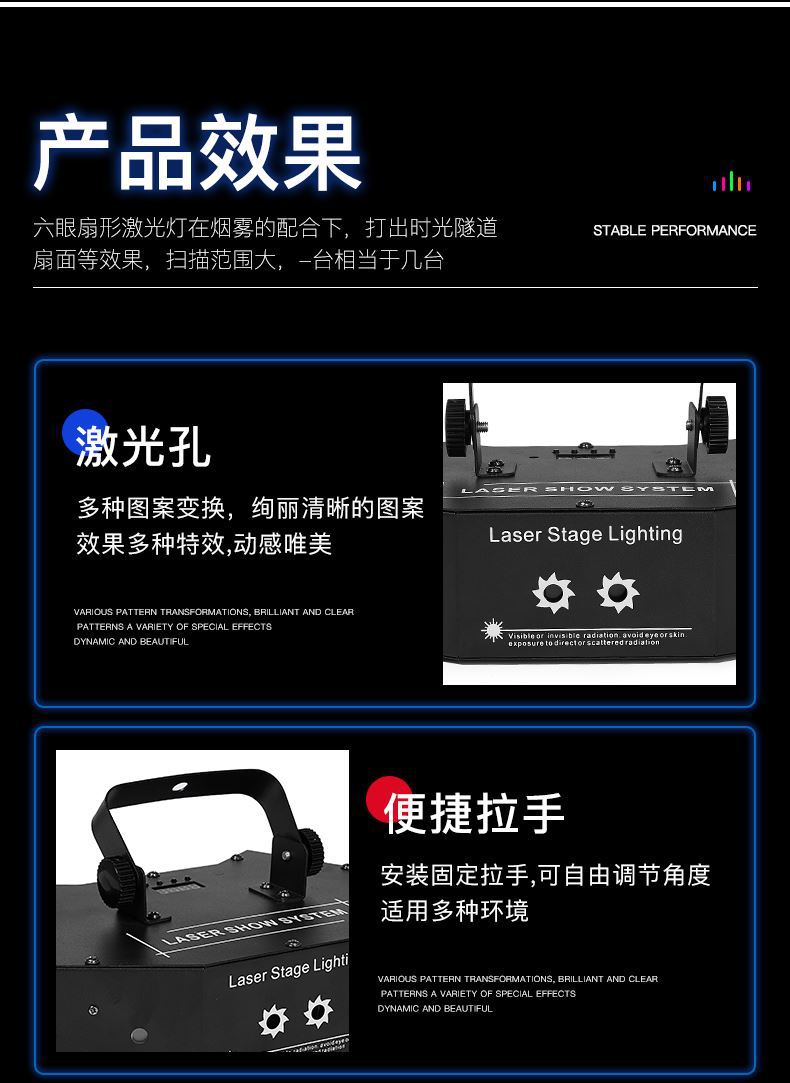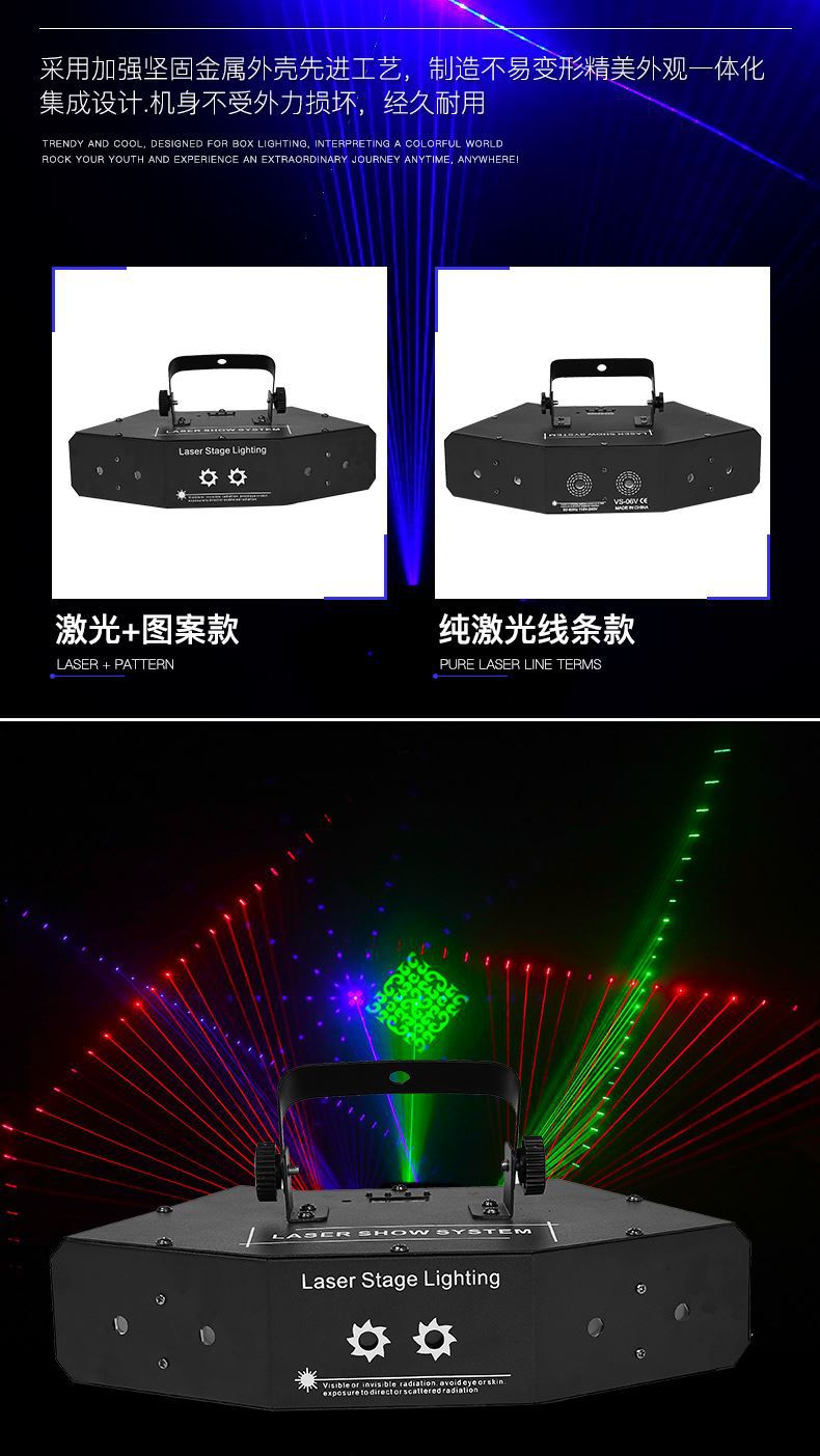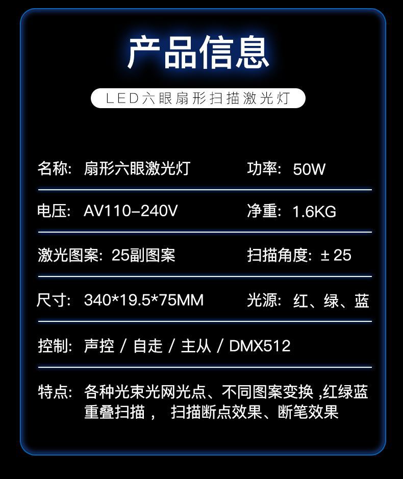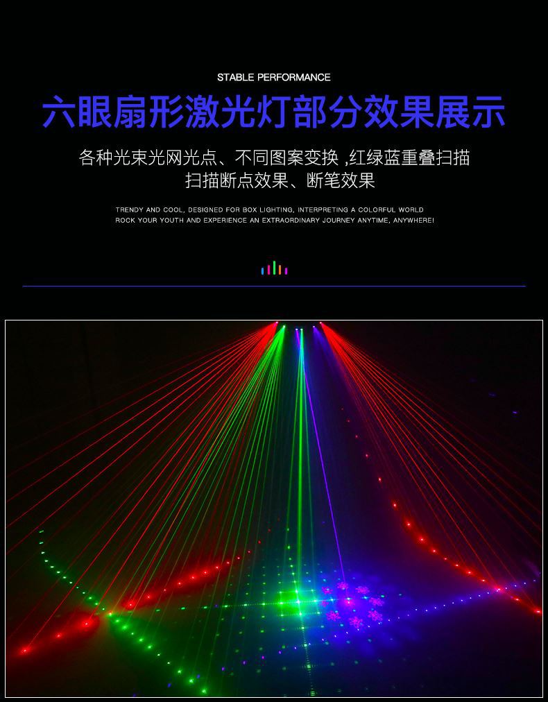 Luz láser de escaneo de seis ojos rojo, verde y azul + patrón