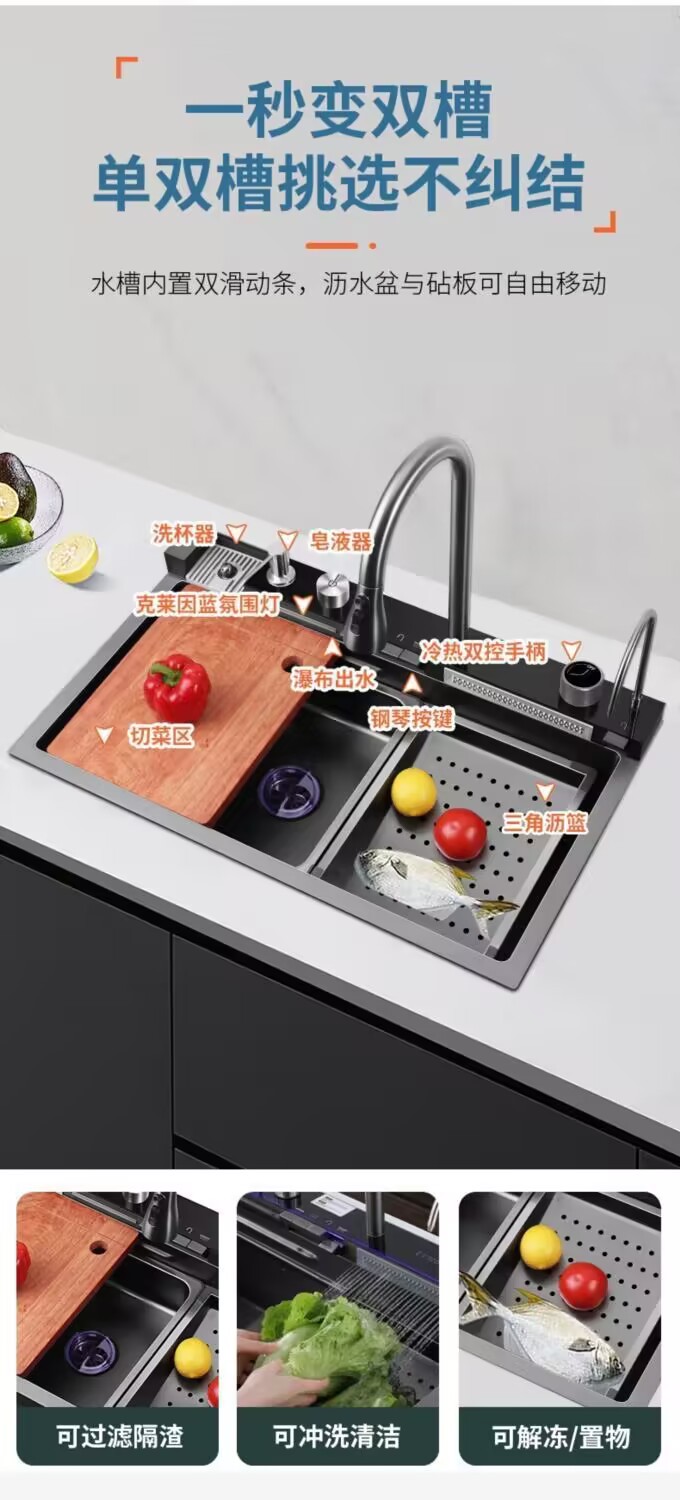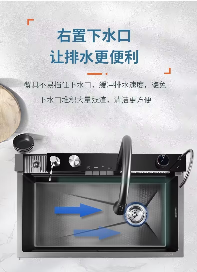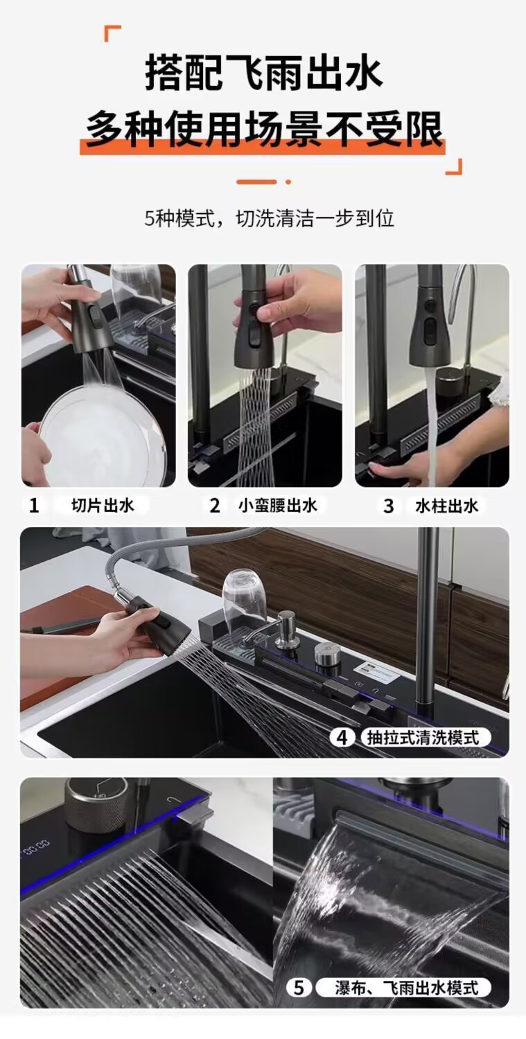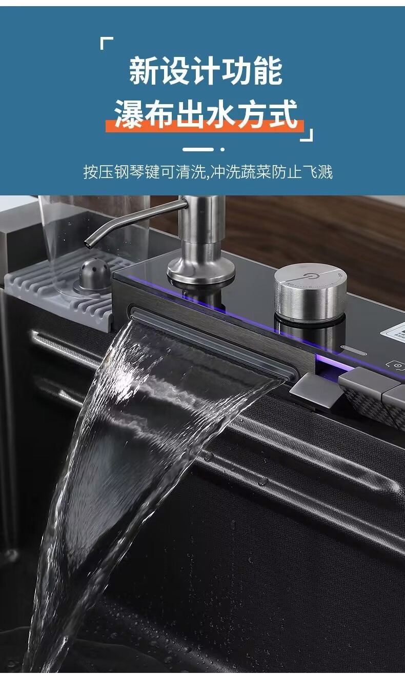 Fregadero grueso 304 piano panal arowana cocina pantalla digital cascada de un solo tanque nano fregadero de lluvia de acero inoxidable