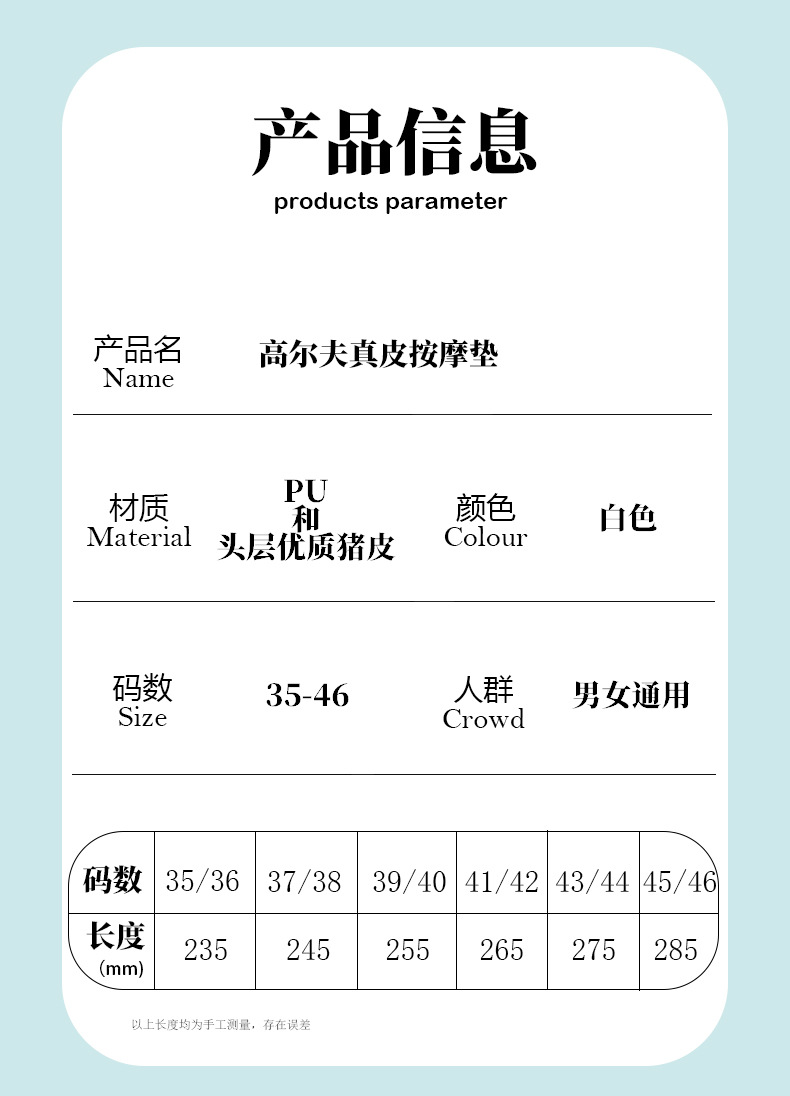 | Color | Almohadilla de masaje de cuero de golf (blanco 35 - 36), almohadilla de masaje de cuero de golf (blanco 37 - 38), almohadilla de masaje de cuero de golf (blanco 39 - 40), almohadilla de masaje de cuero de golf (blanco 41 - 42), almohadilla de masaje de cuero de golf (blanco 43 - 44), almohadilla de masaje de cuero de golf (blanco 45 - 46) |