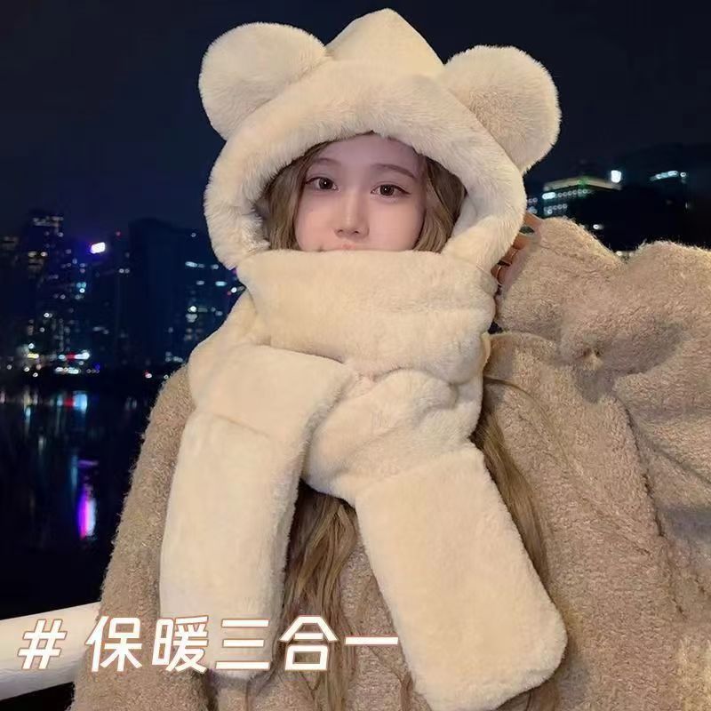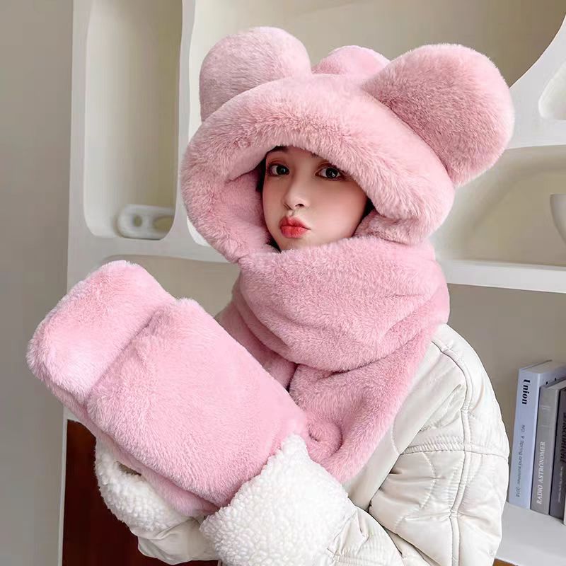 Otoño y invierno nuevo oso sombrero bufandas en una mujer invierno lindo guantes de cuello para niñas ciclismo conjunto de tres piezas