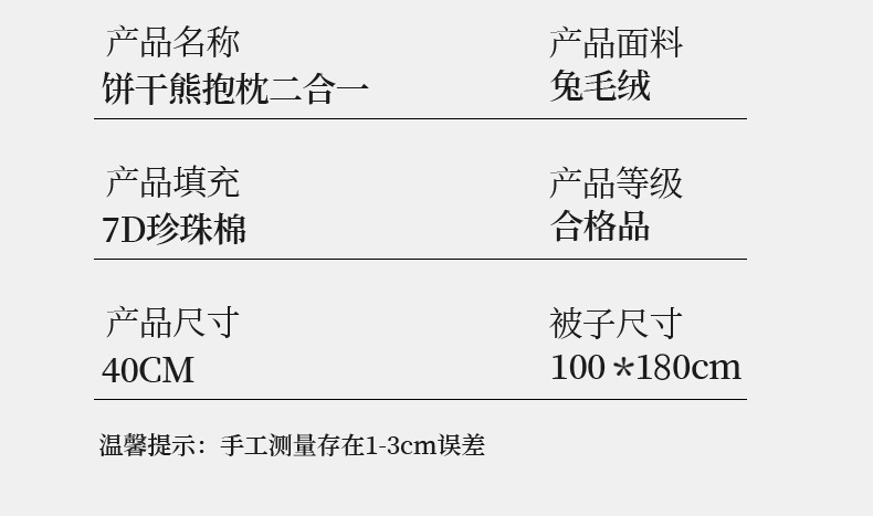 | Color | El oso amarillo de limón sostiene la almohada en dos en uno, y el oso de chocolate sostiene la almohada en dos en uno. |