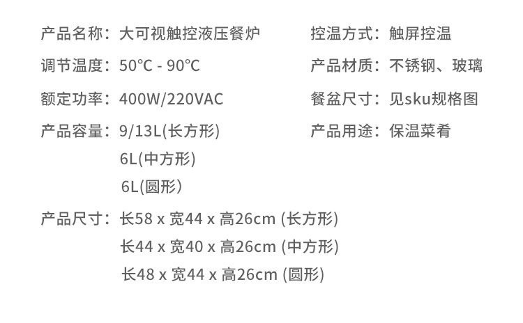 | Especificaciones | 基础款-电热板旋钮式调温不带显示屏-长方形单格盆-9升-保修36个月,基础款-电热板旋钮式调温不带显示屏-长方形双格盆-9升-保修36个月,基础款-电热板旋钮式调温不带显示屏-长方形三格盆-9升-保修36个月,基础款-电热板旋钮式调温不带显示屏-长方形单格盆-13升-保修36个月,基础款-电热板旋钮式调温不带显示屏-长方形双格盆-13升-保修36个月,基础款-电热板旋钮式调温不带显示屏-长方形三格盆-13升-保修36个月,基础款-电热板旋钮式调温不带显示屏-长方形单格冲孔盆-9升-保修36个月,基础款-电热板旋钮式调温不带显示屏-长方形双格冲孔盆-9升 -保修36个月,基础款-电热板旋钮式调温不带显示屏-长方形三格冲孔盆-9升-保修36个月,基础款-电热板旋钮式调温不带显示屏-长方形单格陶瓷盆-9升-保修36个月,基础款-电热板旋钮式调温不带显示屏-长方形双格陶瓷盆-9升-保修36个月,基础款-电热板旋钮式调温不带显示屏-长方形三格陶瓷盆-9升-保修36个月,升级触屏款-触控调温带显示屏-长方形双格盆-9升-保修36个月,升级触屏款-触控调温带显示屏-长方形三格盆-9升-保修36个月,升级触屏款-触控调温带显示屏-长方形单格盆-13升-保修36个月,升级触屏款-触控调温带显示屏-长方形双格盆-13升-保修36个月,升级触屏款-触控调温带显示屏-长方形三格盆-13升-保修36个月,升级触屏款-触控调温带显示屏-长方形单格冲孔盆-9升-保修36个月,升级触屏款-触控调温带显示屏-长方形双格冲孔盆-9升 -保修36个月,升级触屏款-触控调温带显示屏-长方形三格冲孔盆-9升-保修36个月,升级触屏款-触控调温带显示屏-长方形单格陶瓷盆-9升-保修36个月,升级触屏款-触控调温带显示屏-长方形双格陶瓷盆-9升-保修36个月,升级触屏款-触控调温带显示屏-长方形三格陶瓷盆-9升-保修36个月,升级触屏款-触控调温带显示屏-长方形单格盆-9升-保修36个月 |