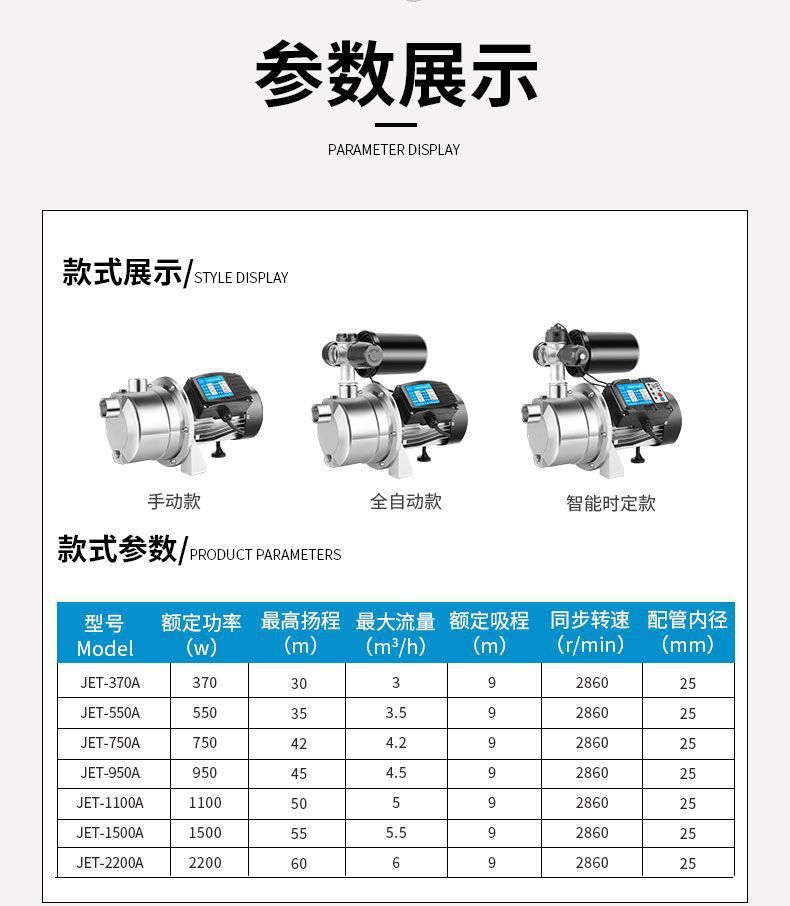 | Especificaciones | 370w manual / arranque enchufable + protección de sobrecalentamiento, 550w manual / arranque enchufable + protección de sobrecalentamiento, 750w manual / arranque enchufable + protección de sobrecalentamiento, 950w manual / arranque enchufable + protección de sobrecalentamiento, 1100w manual / arranque enchufable + protección de sobrecalentamiento, 1500w manual / arranque enchufable + protección de sobrecalentamiento, 2200w manual / arranque enchufable + protección de sobrecalentamiento, 370w automático / arranque y parada automática + protección de sobrecalentamiento, 550w automático / arranque y parada automática + protección de sobrecalentamiento, 750w automático / arranque y parada automática + protección de sobrecalentamiento, 1100w automático / arranque y parada automática + protección de sobrecalentamiento, 1500w modelo automático / arranque y parada automáticos + protección contra sobrecalentamiento, 2200w modelo automático / arranque y parada automáticos + Protección contra sobrecalentamiento, 370w modelo inteligente / arranque y parada de doble control + protección contra sobrecalentamiento, 550w modelo inteligente / arranque y parada de doble control + protección contra sobrecalentamiento, 750w modelo inteligente / arranque y parada de doble control + protección contra sobrecalentamiento, 950w modelo inteligente / arranque y parada de doble control + protección contra sobrecalentamiento, 1100w Modelo inteligente / arranque y parada de doble control + protección contra sobrecalentamiento, modelo inteligente de 1500w / arranque y parada de doble control + protección contra sobrecalentamiento, modelo inteligente de 2200w / arranque y parada de doble control + protección contra sobrecalentamiento |