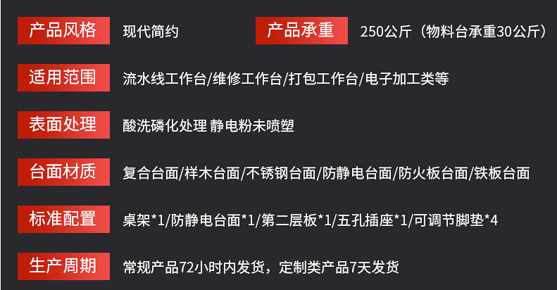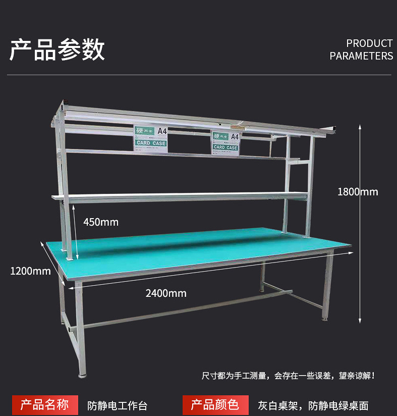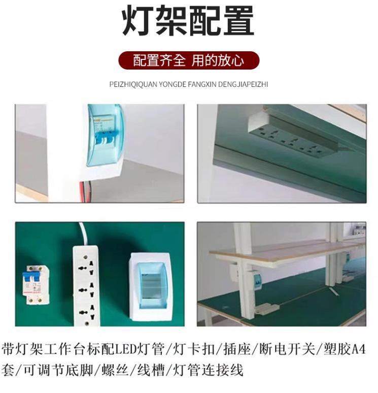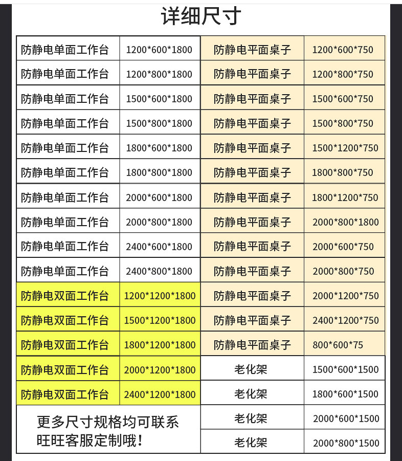 | Especificaciones y modelos | 长60宽40高75(平台),长60宽60高75(平台),长80宽40高75(平台),长80宽60高75(平台),长100宽40高75(平台),长120宽40高75(平台),长100宽60高75(平台),长120宽60高75(平台),长120宽80高75(平台),长120宽100高75(平台),长120宽120高75(平台),长150宽60高75(平台),长150宽80高75(平台),长150宽100高75(平台),长180宽60高75(平台),长180宽80高75(平台),长200宽60高75(平台),长200宽80高75(平台),长240宽60高75(平台),长240宽80高75(平台),长180宽100高75(平台),长200宽100高75(平台),长240宽100高75(平台),长200宽120高75(平台),长240宽40高75(平台),长240宽120高75(平台),长120宽60高180(单面)含灯,长120宽80高180(单面)含灯,长150宽60高180(单面)含灯,长150宽80高180(单面)含灯,长180宽60高180(单面)含灯,长180宽80高180(单面)含灯,长200宽60高180(单面)含灯,长150宽100高180(单面)含灯,长200宽80高180(单面)含灯,长240宽60高180(单面)含灯,长240宽80高180(单面)含灯,长200宽100高180(单面)含灯,长240宽100高180(单面)含灯,长150宽120高180(双面)含灯,长180宽120高180(双面)含灯,长200宽120高180(双面)含灯,长240宽120高180(双面)含灯,防静电双面加腿150*120*180,防静电双面加腿180*120*180,防静电双面加腿200*120*180,防静电双面加腿240*100*180,防静电双面加腿240*120*180,防静电双面加腿240*160*180,防静电凳子30*30*45 |