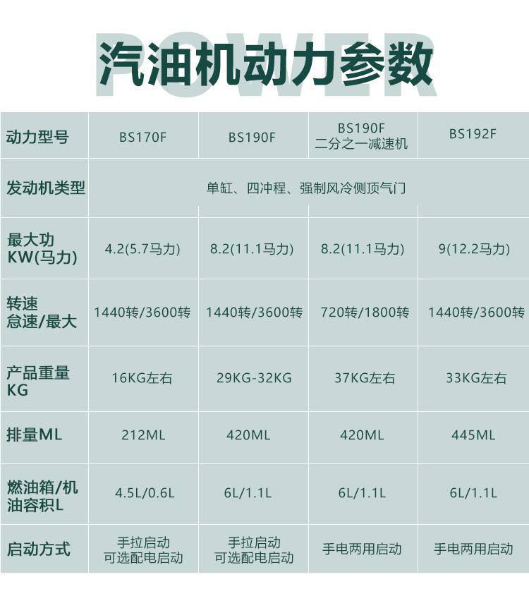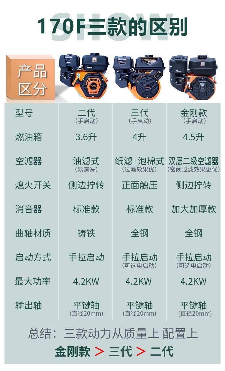 | Especificaciones | Bs170f King Kong modelo + aceite de entrega / rueda de cinturón, bs170f King Kong modelo arranque eléctrico + aceite de entrega, bs170f Bashan modelo + aceite de entrega / rueda de cinturón, bs170f modelo de tres generaciones + aceite de entrega / rueda de cinturón, bs170f maquinaria agrícola 20 empalmes + aceite + línea de extinción, bs170f maquinaria agrícola 25 empalmes + aceite + línea de extinción, bs190f Bashan modelo + aceite de entrega / rueda de cinturón, bs190f arranque eléctrico + aceite de entrega / rueda de cinturón, bs192f arranque eléctrico + aceite de entrega / rueda de cinturón, bs190f arranque eléctrico medio RPM |