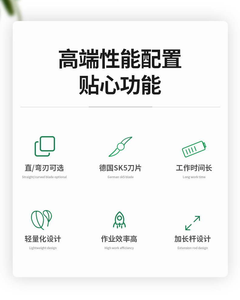 | Especificaciones del producto | El cuchillo recto predeterminado requiere un machete o un paquete de ranura de recolección para contactar con el servicio al cliente. nota: toda la máquina de 24v no contiene baterías (1,6 metros) necesita baterías propias. toda la máquina de 24v no contiene baterías (1,6 metros) necesita baterías propias. toda la máquina contiene baterías de litio 24v12ah (1,6 metros) para trabajar durante 5 horas. toda La máquina contiene baterías de litio 24v20ah (1,6 metros) para trabajar durante 7 - 8 horas. toda la máquina contiene baterías de litio 24v30ah (1,6 metros) para trabajar durante más de 12 horas. toda la máquina de 48v no contiene baterías (1,6 metros) necesita baterías propias. toda la máquina contiene baterías de litio 48v12ah (1,6 metros) para trabajar durante 6 horas y toda la máquina necesita baterías de 24v (2 metros).(con tanque de recolección) batería propia, toda la máquina contiene 24v12ah batería de litio (2 metros) que funciona durante 5 horas, toda la máquina contiene 24v20ah batería de litio (2 metros) que funciona durante 7 - 8 horas, toda la máquina contiene 24v30ah batería de litio (2 metros) que funciona durante más de 12 horas, toda la máquina 48v no contiene batería (2 metros) necesita batería propia, toda la máquina contiene 48v12ah Las baterías de litio (2 metros) funcionan durante 6 horas, las máquinas retráctiles de 2,3 metros no contienen baterías necesitan baterías propias, las máquinas retráctiles de 2,3 metros + 24v12ah funcionan durante 5 horas, las máquinas retráctiles de 2,3 metros + 24v20ah funcionan durante 7 - 8 horas, las máquinas retráctiles de 2,3 metros + 24v30ah funcionan durante más de 12 horas, las máquinas retráctiles de 2,3 metros + 48v no contienen baterías necesitan baterías propias, las máquinas retráctiles de 2,3 metros + 48v12ah funcionan durante 6 horas, las máquinas retráctiles de 3,2 metros + 24v (fácil recolección) necesitan baterías propias, las máquinas retráctiles de 3,2 metros.+ 24v12ah batería de litio funciona durante 5 horas, toda la máquina telescópica de 3,2 metros + 24v20ah batería de litio funciona durante 7 - 8 horas, toda la máquina telescópica de 3,2 metros + 24v30ah batería de litio funciona durante más de 12 horas, toda la máquina telescópica de 3,2 metros 48v sin batería necesita su propia batería, toda la máquina telescópica de 3,2 metros + 48v12ah batería de litio funciona durante 6 horas, cuchillo de machete, todos los paquetes se pueden cambiar por machete o ranura de recolección. |