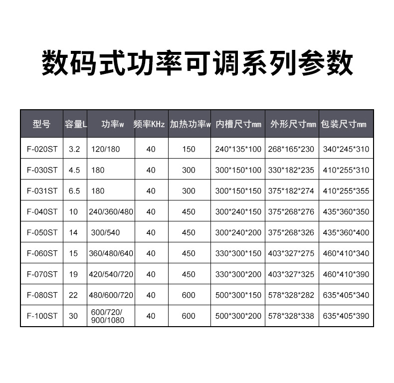 | Color | 双功率可调F-009SD【升级款】1.3L80W(1个震子)+清洗篮,双功率可调F-009SD【加强款】1.3L120W(2个震子)+清洗篮,双功率可调F-010SD【升级款】2L80W(1个震子)+清洗篮,双功率可调F-010SD【加强版】2L120W(2个震子)+清洗篮,双功率可调F-020SD【升级款】3.2L120W(2个震子)+清洗篮,双功率可调F-020SD【加强款】3.2L180W(3个震子)+清洗篮,双功率可调F-030SD【升级款】4.5L180W(3个震子)+清洗篮,双功率可调F-031SD【升级款】6.5L180W(3个震子)+排水四件套+清洗篮,双功率可调F-040SD【升级款】10L240W(4个震子)+排水四件套+清洗篮,双功率可调F-040SD【加强款】10L360W(6个震子)+排水四件套+清洗篮,双功率可调F-040SD【高配款】10L480W(8个震子)+排水四件套+清洗篮,双功率可调F-050SD【升级款】14L300W(5个震子)+排水四件套+清洗篮,双功率可调F-050SD【加强款】14L360W(6个震子)+排水四件套+清洗篮,双功率可调F-050SD【高配款】14L540W(9个震子)+排水四件套+清洗篮,双功率可调F-060SD【升级款】15L360W(6个震子)+排水四件套+清洗篮,双功率可调F-060SD【加强款】15L480W(8个震子)+排水四件套+清洗篮,双功率可调F-060SD【高配款】15L600W(10个震子)+排水四件套+清洗篮,双功率可调F-070SD【升级款】19L420W(7个震子)+排水四件套+清洗篮】,双功率可调F-070SD【加强款】19L540W(9个震子)+排水四件套+清洗篮,双功率可调F-070SD【高配款】19L720W(12个震子)+排水四件套+清洗篮,双功率可调F-080SD【升级款】22L480W(8个震子)+排水四件套+清洗篮,双功率可调F-080SD【加强款】22L600W(10个震子)+排水四件套+清洗篮,双功率可调F-080SD【高配款】22L720W(12个震子)+排水四件套+清洗篮,双功率可调F-100SD【升级款】30L600W(10个震子)+排水四件套+清洗篮,双功率可调F-100SD【加强款】30L720W(12个震子)+排水四件套+清洗篮,双功率可调F-100SD【高配款】30L900W(15个震子)排水四件套+清洗篮,双功率可调F-100SD【高配款】30L1080W(18个震子)排水四件套+清洗篮,F-120SD【36L720W(12个震头)+清洗篮,F-120SDPLUS【36L1200W(20个震头)+清洗篮,F-180SD【60L1080W(18个震头)+清洗篮,F-180SDPLUS【60L1500W(25个震头)+清洗篮,F-181SD【63L1080W(18个震头)+清洗篮,F-181SDPLUS【63L1500W(25个震头)+,全功率可调:F-020ST:3.2L0-120W可调(2个震头)+清洗篮,全功率可调:F-020ST【加强款】3.2L0-180W可调(3个震头)+清洗篮,全功率可调F-030ST:4.5L0-180W可调(3个震头)清洗篮,全功率可调F-031ST:6.5L0-180W可调(3个震头)+清洗篮,全功率可调F-040ST:10L0-240W可调(4个震头)+清洗篮,全功率可调F-040ST:10L加强版0-360W可调(6个震头)+清洗篮,全功率可调F-060ST:15L0-360W可调(6个震头)+清洗篮,全功率可调F-060ST:15L加强版0-480W可调(8个震头)+清洗篮,全功率可调F-080ST:22L0-480W可调(8个震头)+清洗篮,全功率可调F-100ST:30L0-600W可调(10个震头)+清洗篮,全功率可调F-100ST:30L加强版0-720W可调(12个震头)+清洗篮,全功率可调F-100ST:30L加强版0-1080W可调(18个震头)+清洗篮,全功率可调F-100ST:30L加强版0-900W可调(15个震头)+清洗篮,【加强款】F-240PLUS:88L1800W+送篮子,【标准款】F-300A:108L1500W+送篮子,【加强款】F-300PLUS:108L2400W+送篮子 |