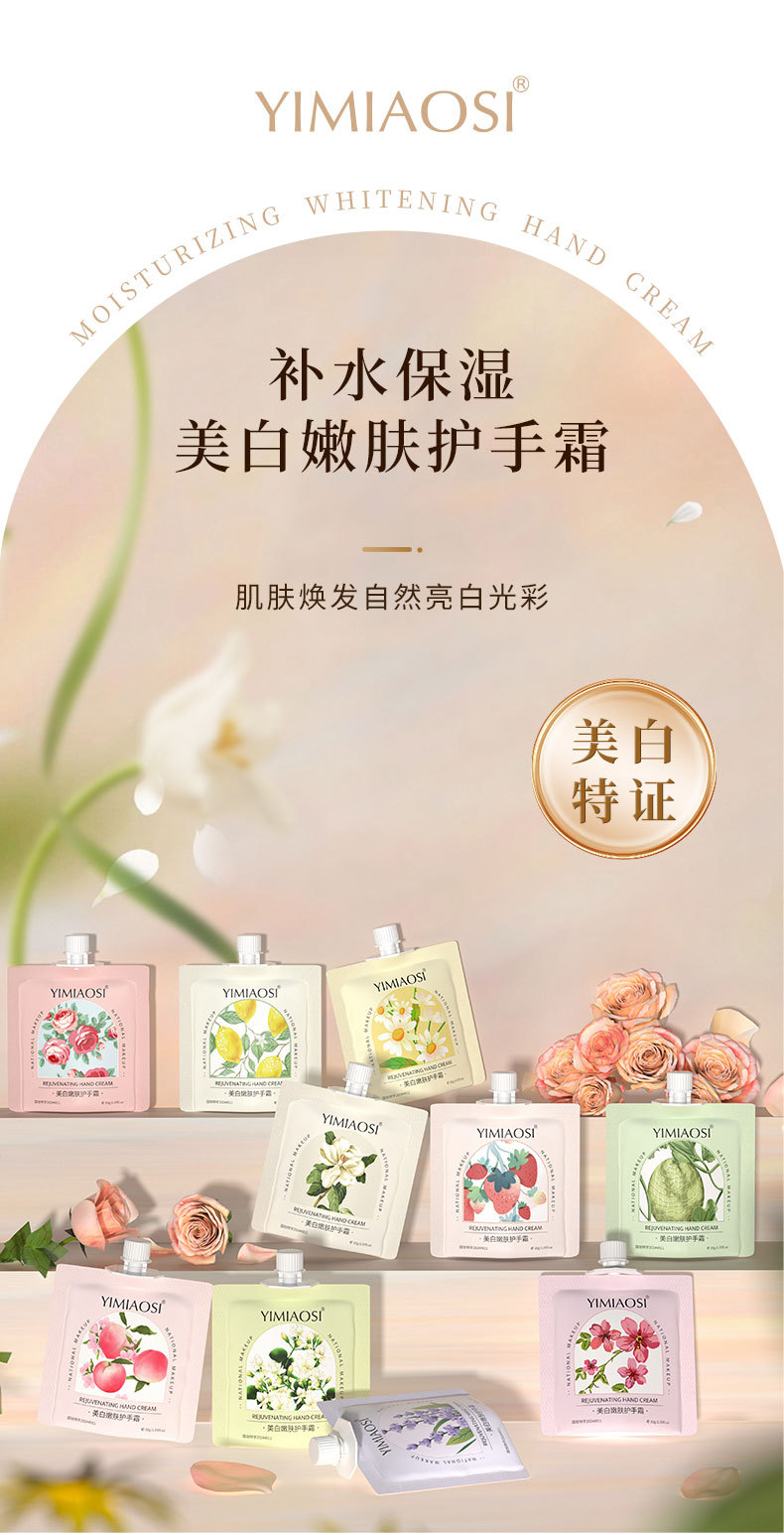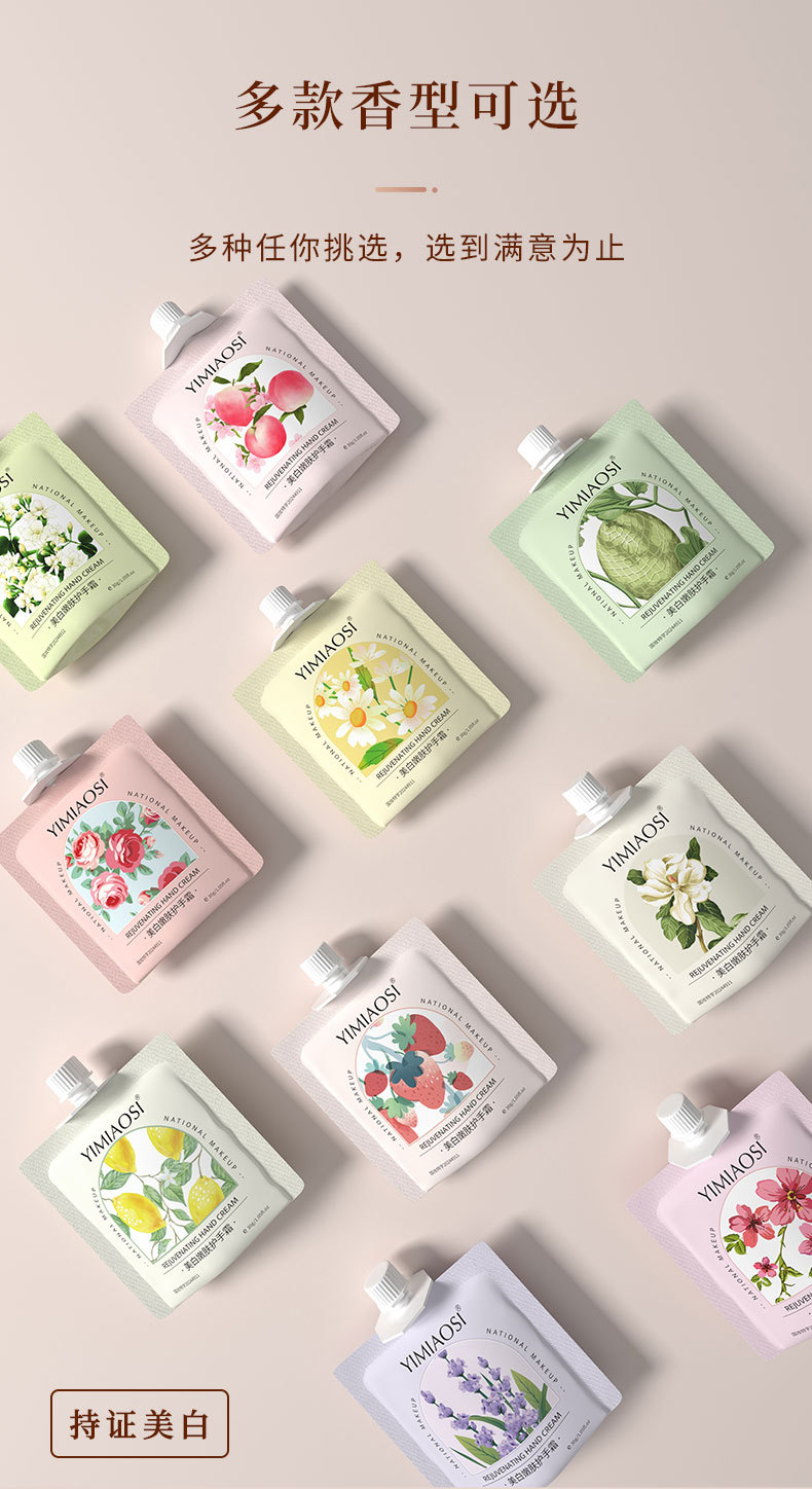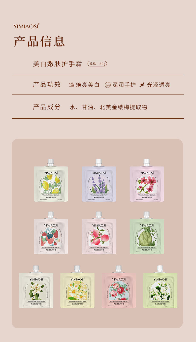 YIMIAOSI blanqueamiento piel rejuvenecedor crema de manos 30g fragancia floral fruta 10 sabor hidratante al por mayor