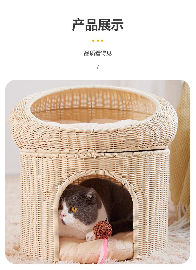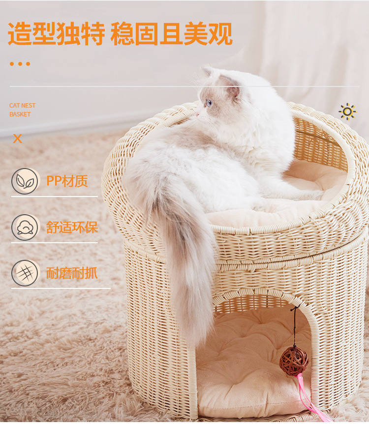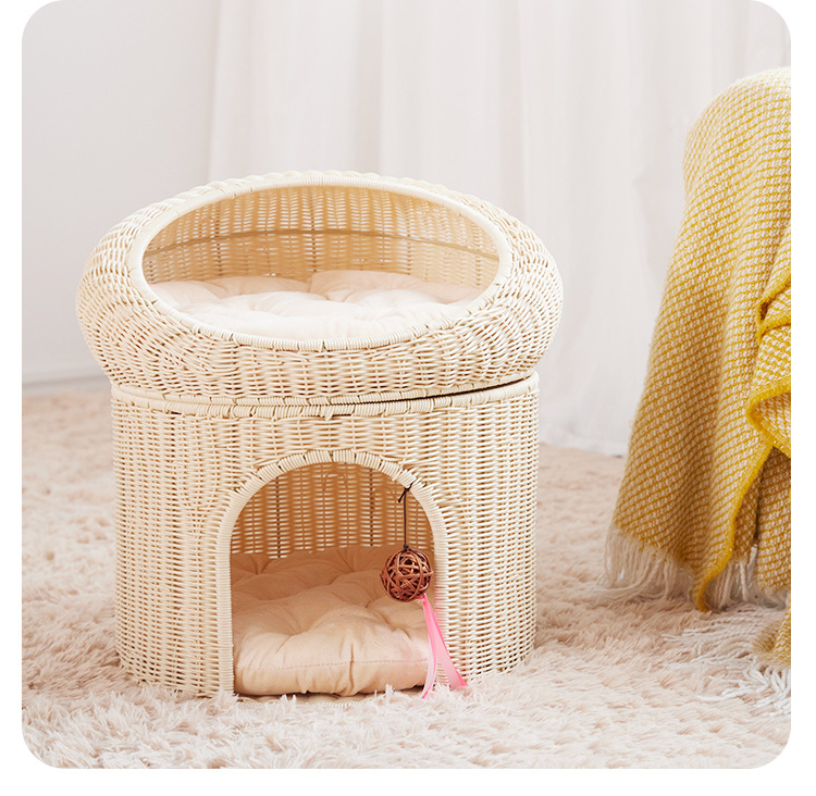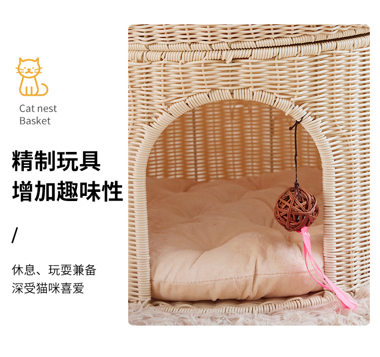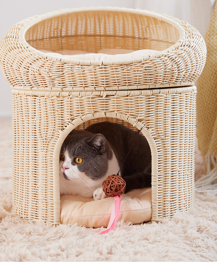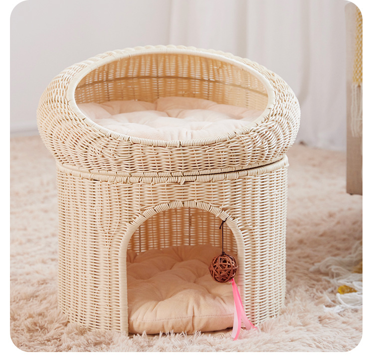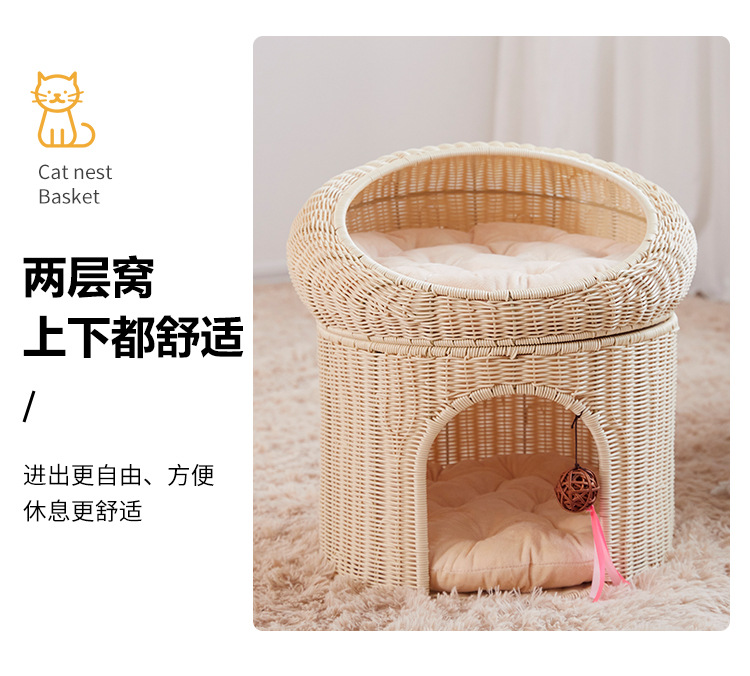Cálido nido de mascota tejido superior e inferior de doble capa gran espacio gato nido semi-cerrado ratán gato nido ratán gato jaula