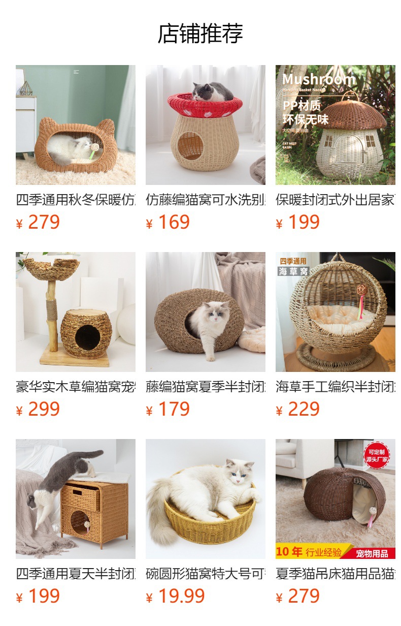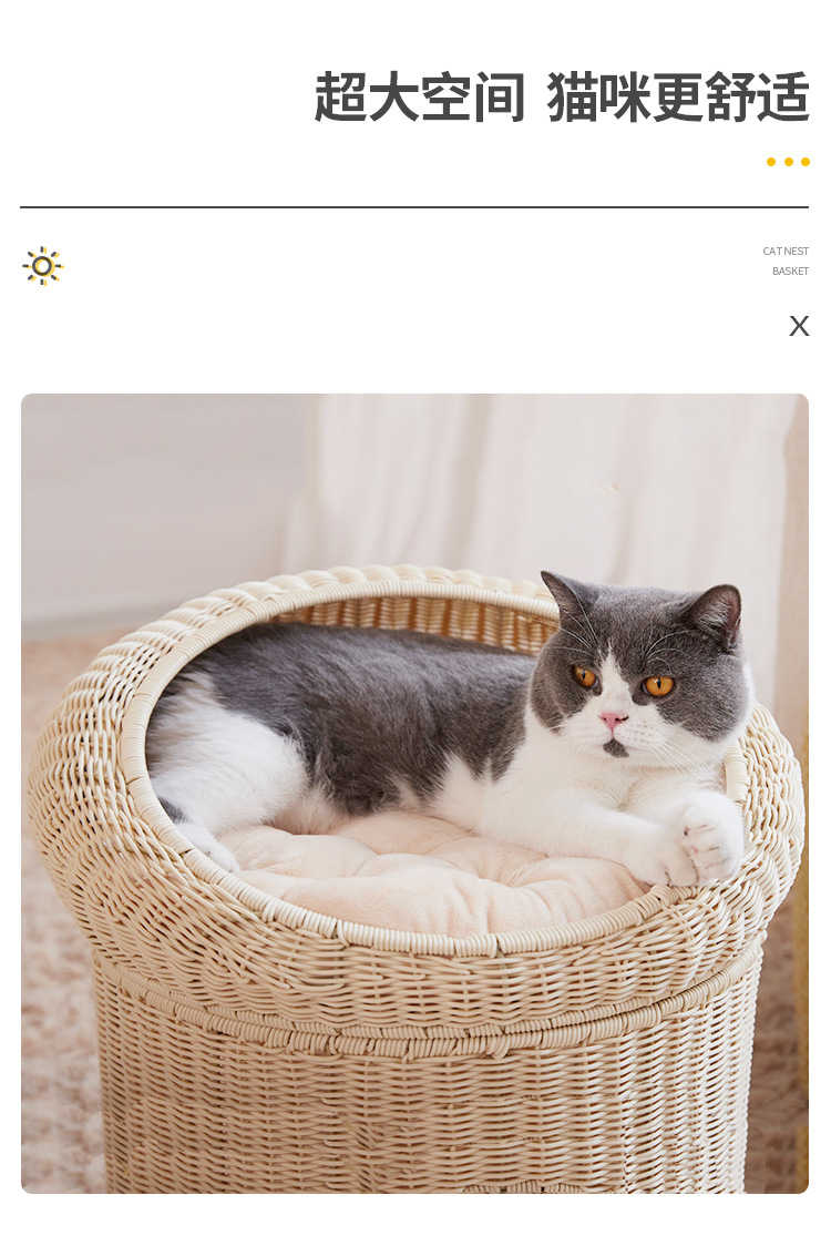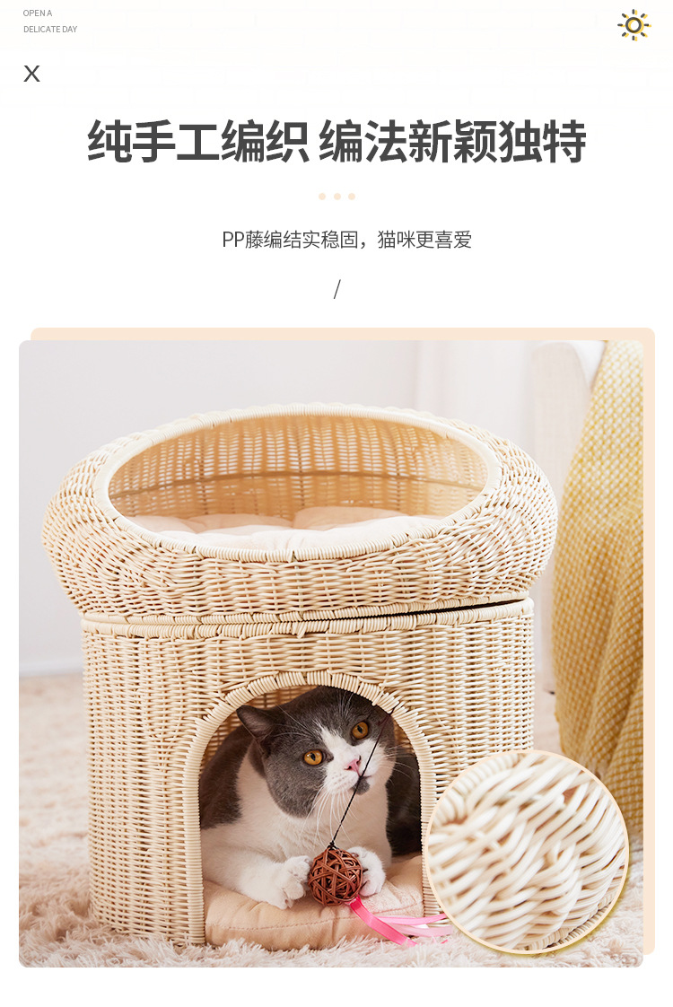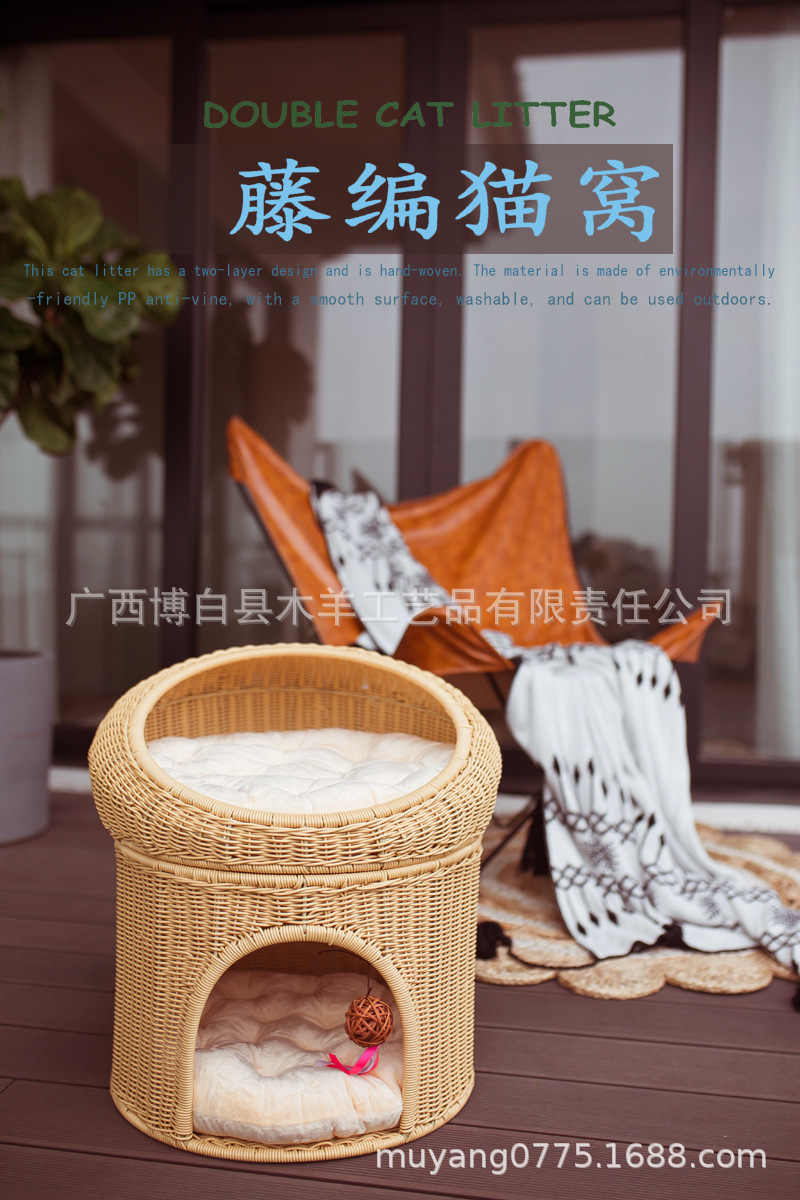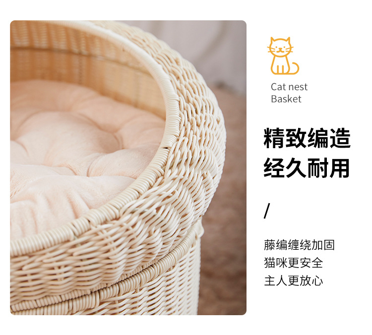 Cálido nido de mascota tejido superior e inferior de doble capa gran espacio gato nido semi-cerrado ratán gato nido ratán gato jaula