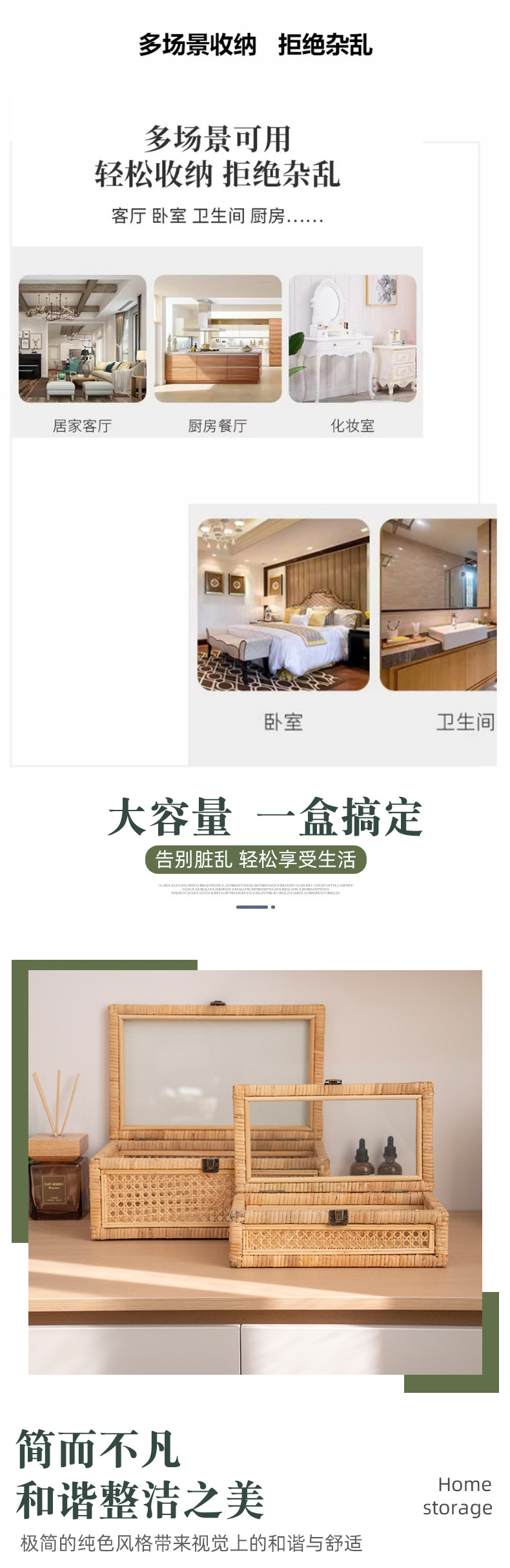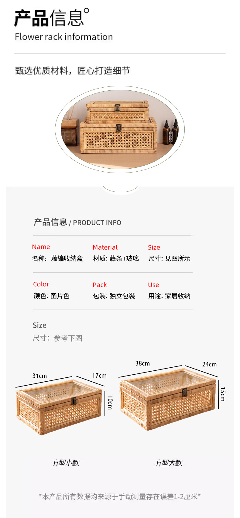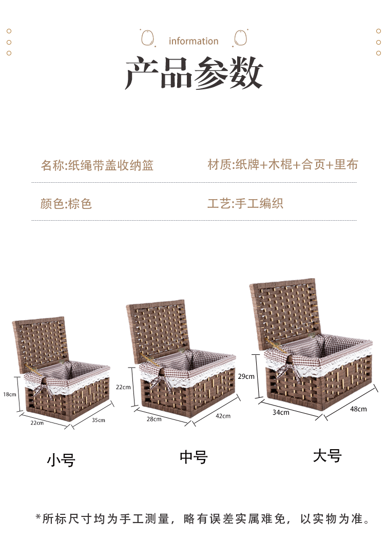 | Color | 35 * 22 * 18cm con tapa pequeña (con cadena en un lado), 42 * 28 * 24cm con tapa media, 48 * 34 * 29cm con tapa grande, un conjunto de tapa (pequeño + medio + grande), caja de almacenamiento de tela de caña pequeña, caja de almacenamiento de tela de caña grande |