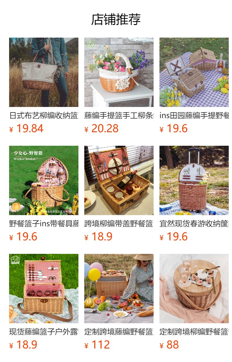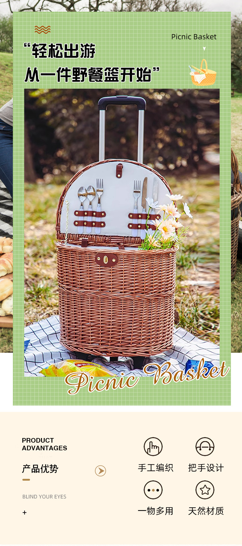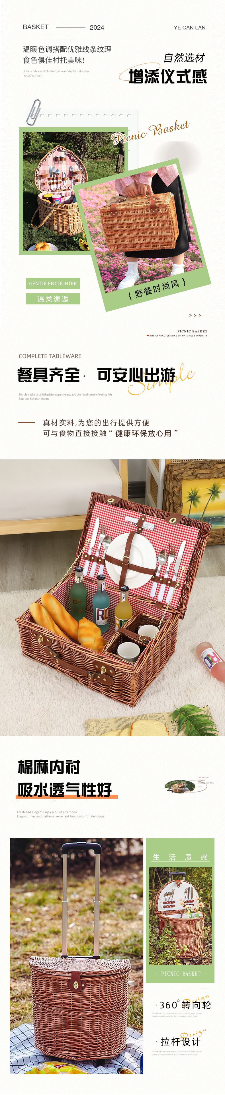 Pastoral canasta de picnic con cubiertos de sauce canasta de comidas portátil excursión camping al aire libre canasta de almacenamiento en línea