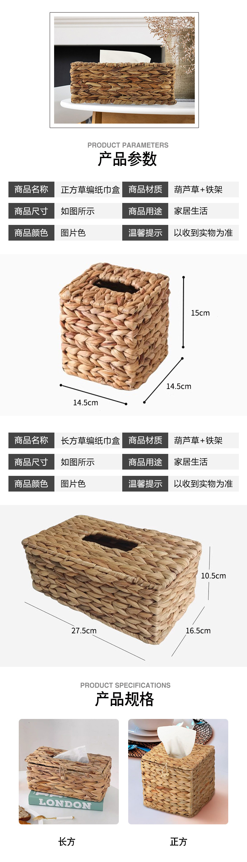 | Color | Cuadrado 14.5 * 14.5 * 15cm, rectangular grande 27.5 * 16.5 * 11cm, apertura cuadrada 22 * 22 * 7CM, caja de extracción de cuerda de algodón, caja de extracción de sauce 17 * 12 * 9CM |