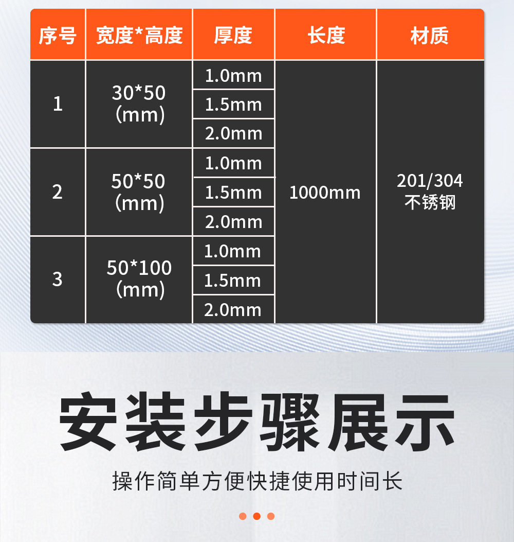 | Especificaciones | 不锈钢尺寸颜色定制请联系客服,201不锈钢0.5mm厚*3cm*3cm,0.6厚-宽3cm*高3cm *1米【201】,0.6厚-宽3cm*高5cm *1米【201】,0.6厚-宽3cm*高8cm *1米【201】,0.6厚-宽3cm*高10cm *1米【201】,0.6厚-宽5cm*高5cm *1米【201】,0.6厚-宽5cm*高8cm *1米【201】,1.0加厚-宽3cm*高3cm *1米【201】,1.0加厚-宽3cm*高5cm *1米【201】,1.0加厚-宽3cm*高8cm *1米【201】,1.0加厚-宽3cm*高10cm *1米【201】,1.0加厚-宽5cm*高5cm *1米【201】,1.0加厚-宽5cm*高8cm *1米【201】,1.0加厚-宽5cm*高10cm *1米【201】,0.6厚-宽3cm*高3cm *1米【304】,1.0加厚-宽3cm*高3cm *1米【304】,0.6厚-宽3cm*高5cm *1米【304】,1.0加厚-宽3cm*高5cm *1米【304】,0.6厚-宽3cm*高8cm *1米【304】,1.0加厚-宽3cm*高8cm *1米【304】,0.6厚-宽3cm*高10cm *1米【304】,1.0加厚-宽3cm*高10cm *1米【304】,0.6厚-宽5cm*高5cm *1米【304】,1.0加厚-宽5cm*高5cm *1米【304】,0.6厚-宽5cm*高8cm *1米【304】,1.0加厚-宽5cm*高8cm *1米【304】,1.0加厚-宽5cm*高10cm *1米【304】,1.0加厚-钛黑-宽3cm*高3cm *1米【201】,1.0加厚-钛黑-宽3cm*高5cm *1米【201】,1.0加厚-钛黑-宽3cm*高8cm *1米【201】,1.0加厚-钛黑-宽3cm*高10cm *1米【201】,1.0加厚-钛黑-宽5cm*高8cm *1米【201】,1.0加厚-钛黑-宽3cm*高3cm *1米【304】,1.0加厚-钛黑-宽3cm*高5cm *1米【304】,1.0加厚-钛黑-宽3cm*高8cm *1米【304】,1.0加厚-钛黑-宽5cm*高8cm *1米【304】,1.0加厚-钛黑-宽3cm*高10cm *1米【304】,1.0加厚-钛黑-宽5cm*高10cm *1米【304】 |