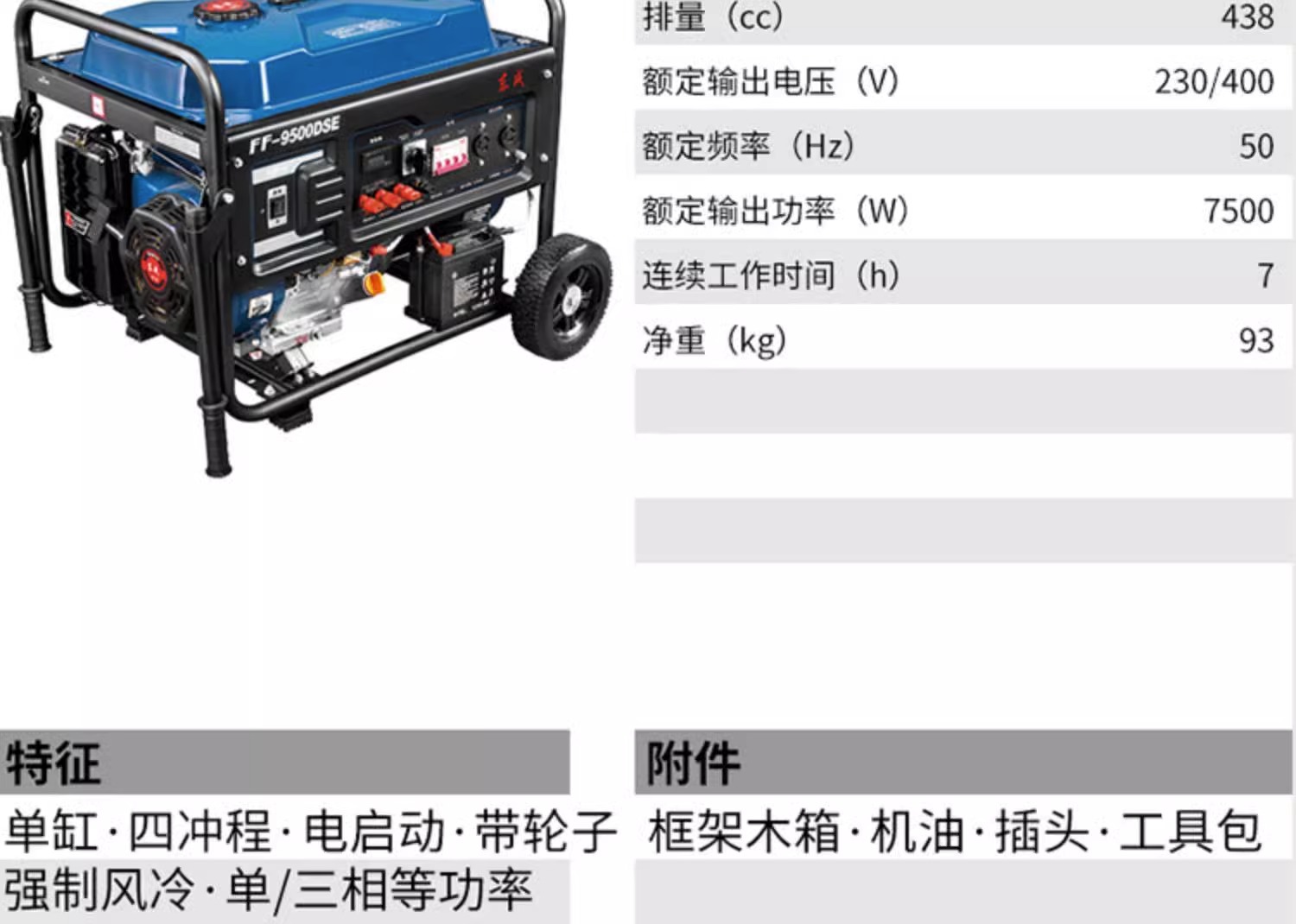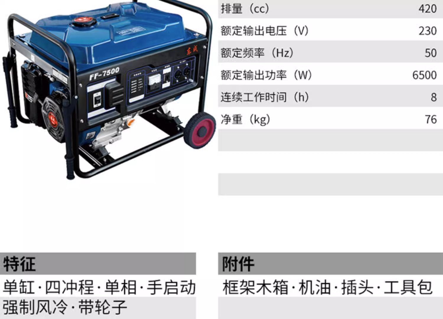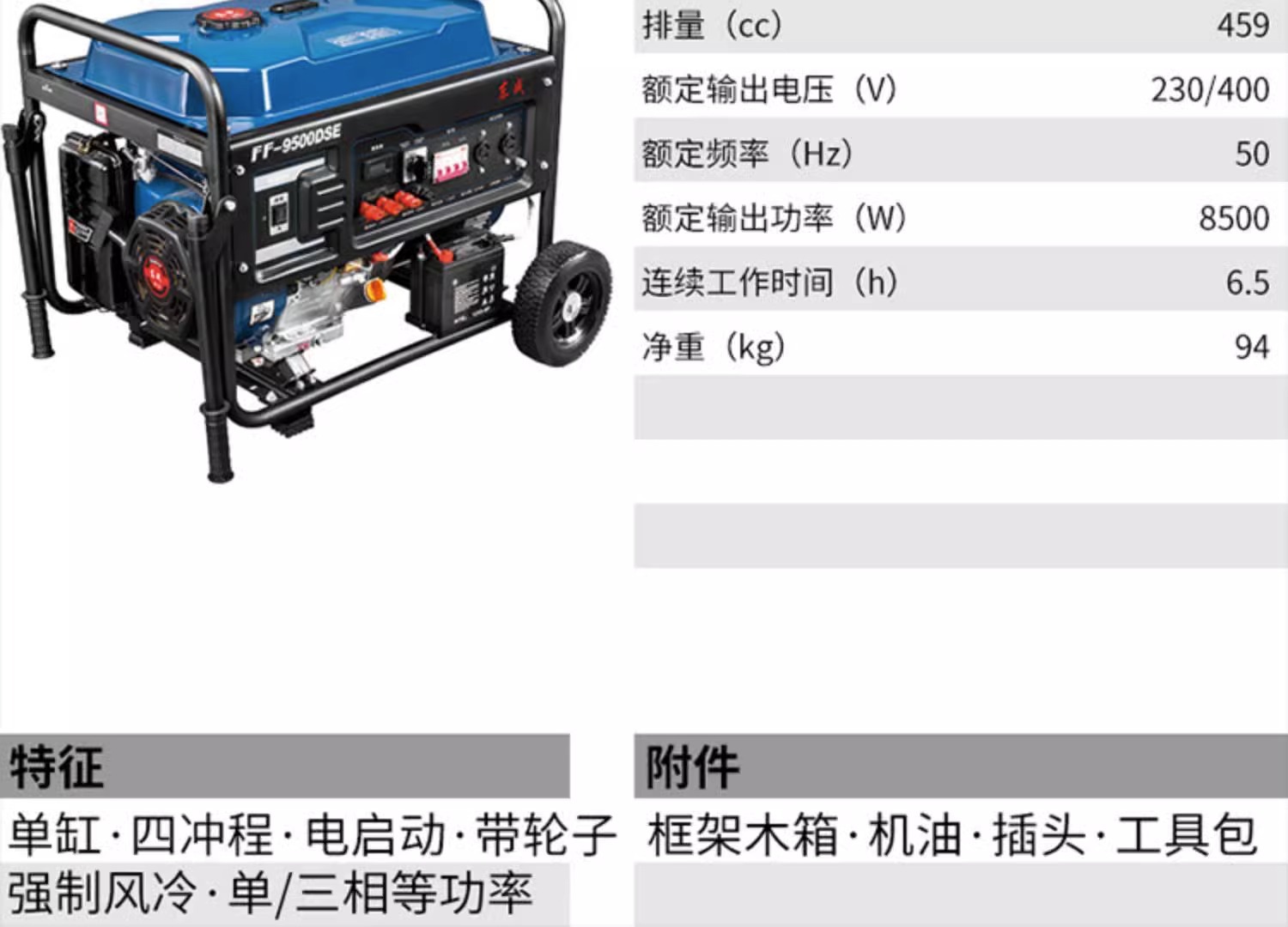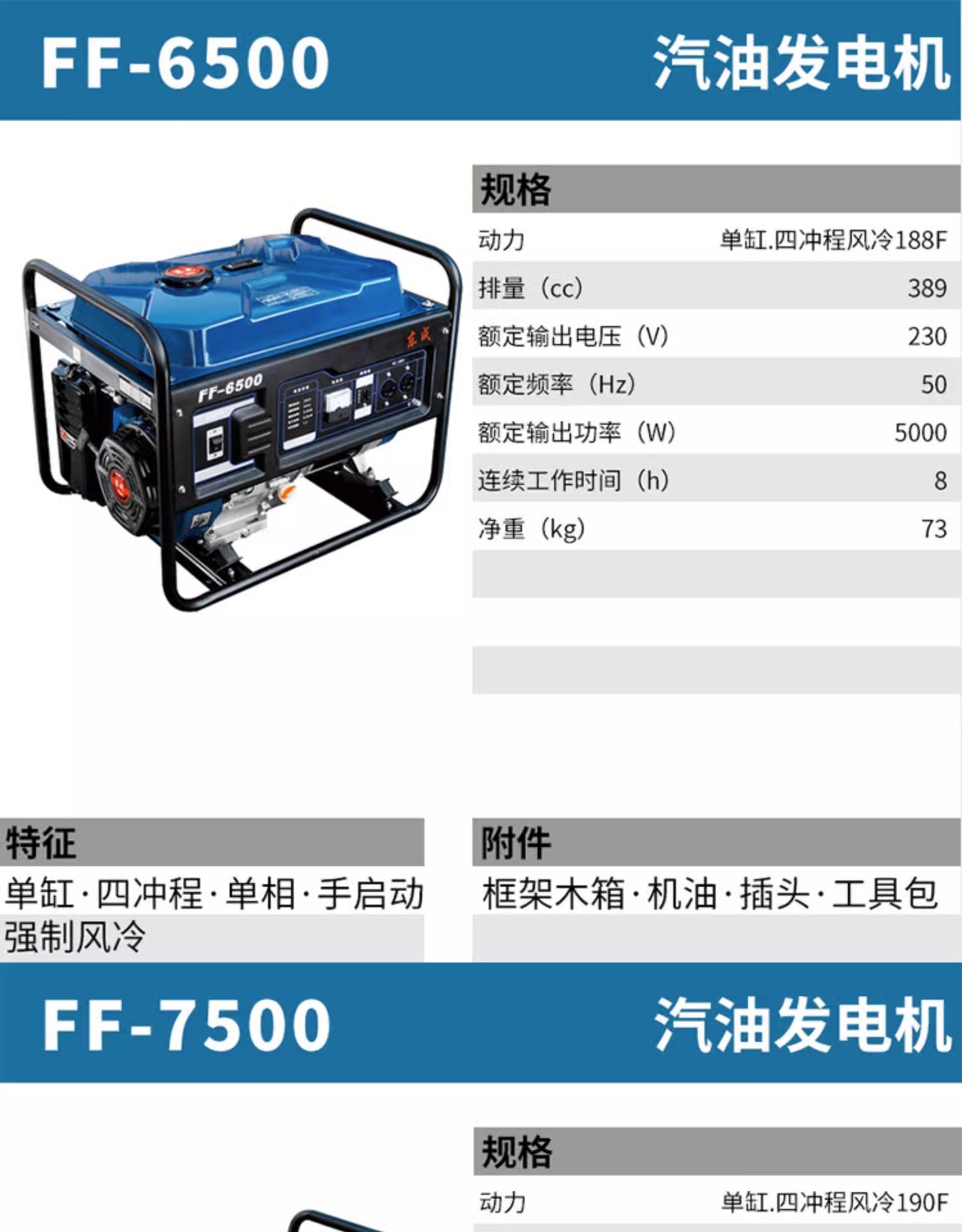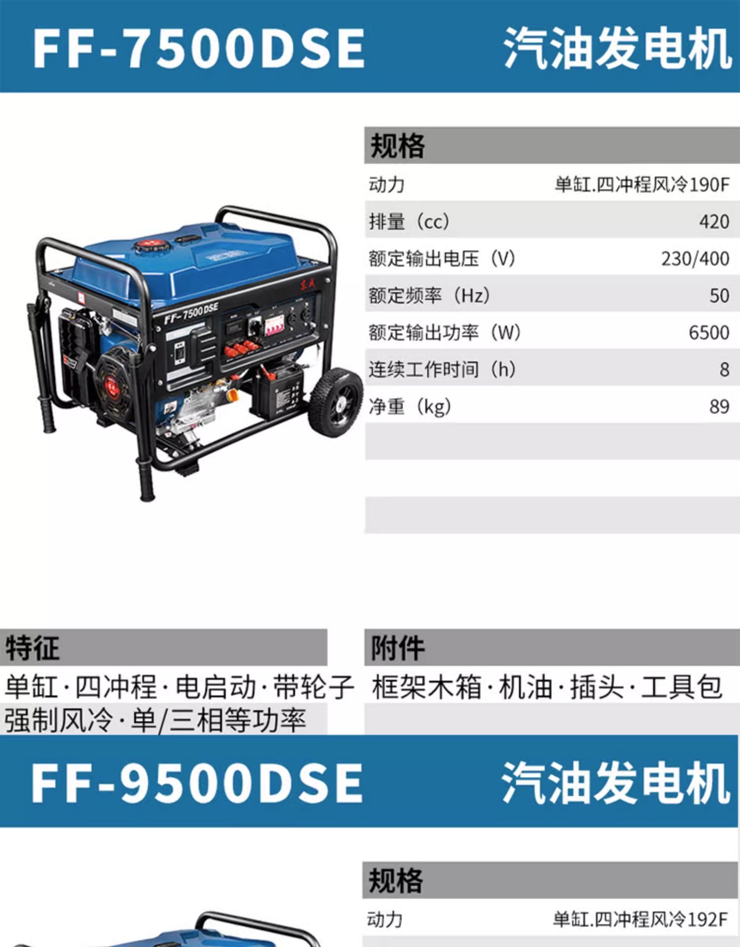| Modelo | FF-3600【220V】2800W,FF-6500【220V】5000W,FF-7500【220V】6000W,FF-7500DSE【220V/380V】6000W,FF-9500E【220V】7000W,FF-9500DSE【220V/380V】7000W,FF-10800DSE【220V/380V】8000W |