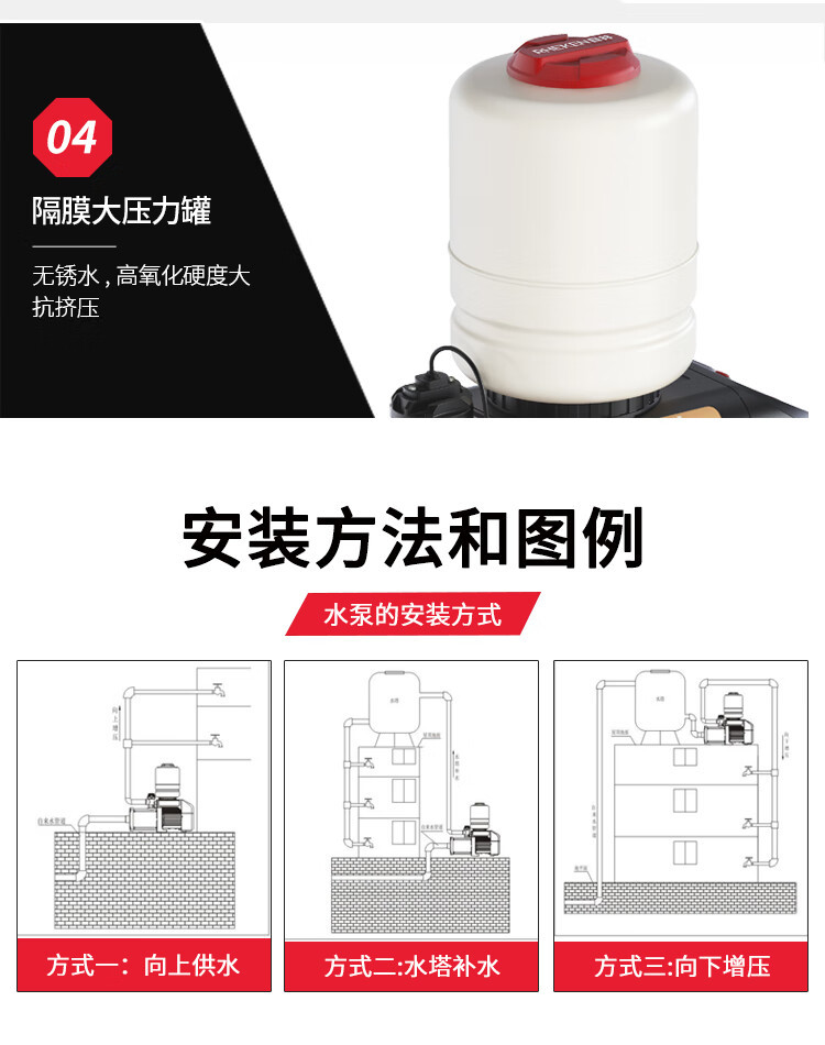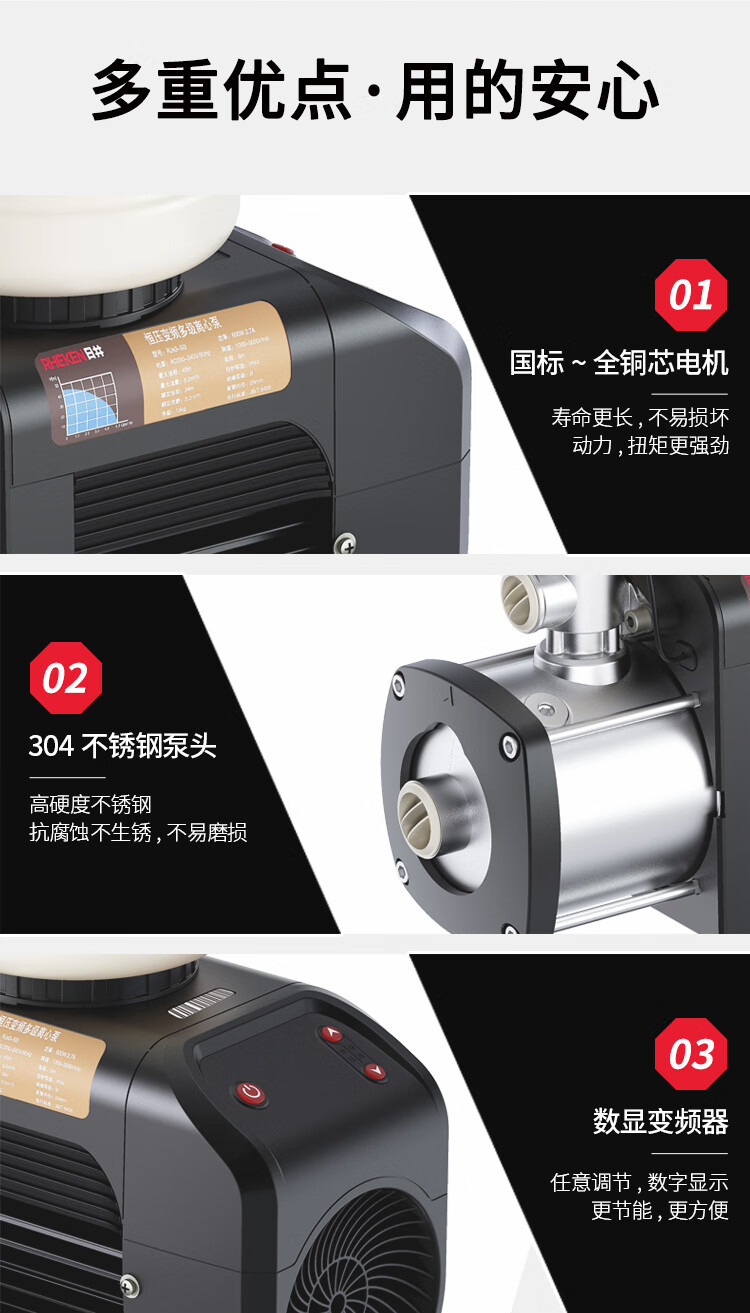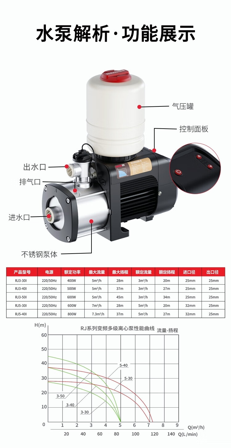 | Especificaciones | Bomba de refuerzo de conversión de frecuencia RJ3-40I 3 metros cuadrados 27 metros 500 vatios,Bomba de refuerzo de conversión de frecuencia RJ3-50I 3 metros cuadrados 34 metros 600 vatios,Bomba de refuerzo de conversión de frecuencia RJ5-30I 5 metros cuadrados 20 metros 600 vatios,Bomba de refuerzo de conversión de frecuencia RJ5-40I 5 metros cuadrados 27 metros 800 vatios,Bomba de refuerzo de conversión de frecuencia RJ3-30I 3 metros cuadrados 20 metros 400 vatios |