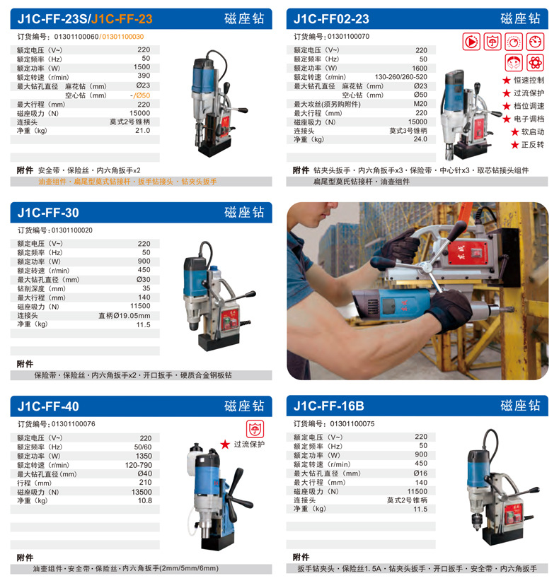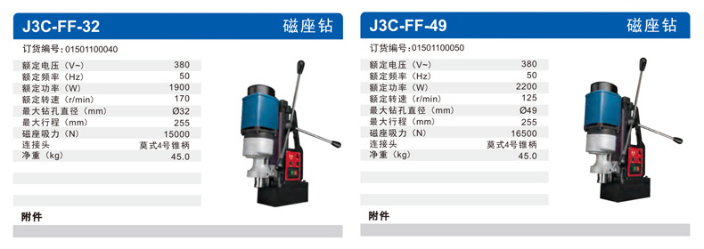 | Modelo | J1C-FF-40 taladro de asiento magnético 220V [1350W], J1C-FF - 16B taladro de asiento magnético 220V [900W], J1C-FF02-23 taladro de asiento magnético 220V [1600W], J1C-FF - 23 taladro de asiento magnético 220V [1500W], J1C-FF - 23S taladro de asiento magnético 220V [1500W], J3C-FF - 32 taladro de asiento magnético 380V [1900W], J3C-FF - 49 taladro de asiento magnético 380V [2200W |