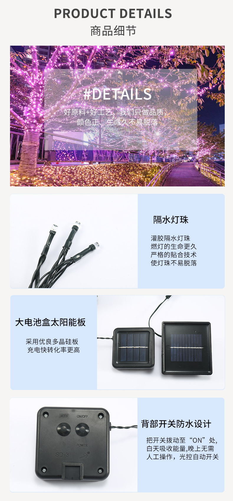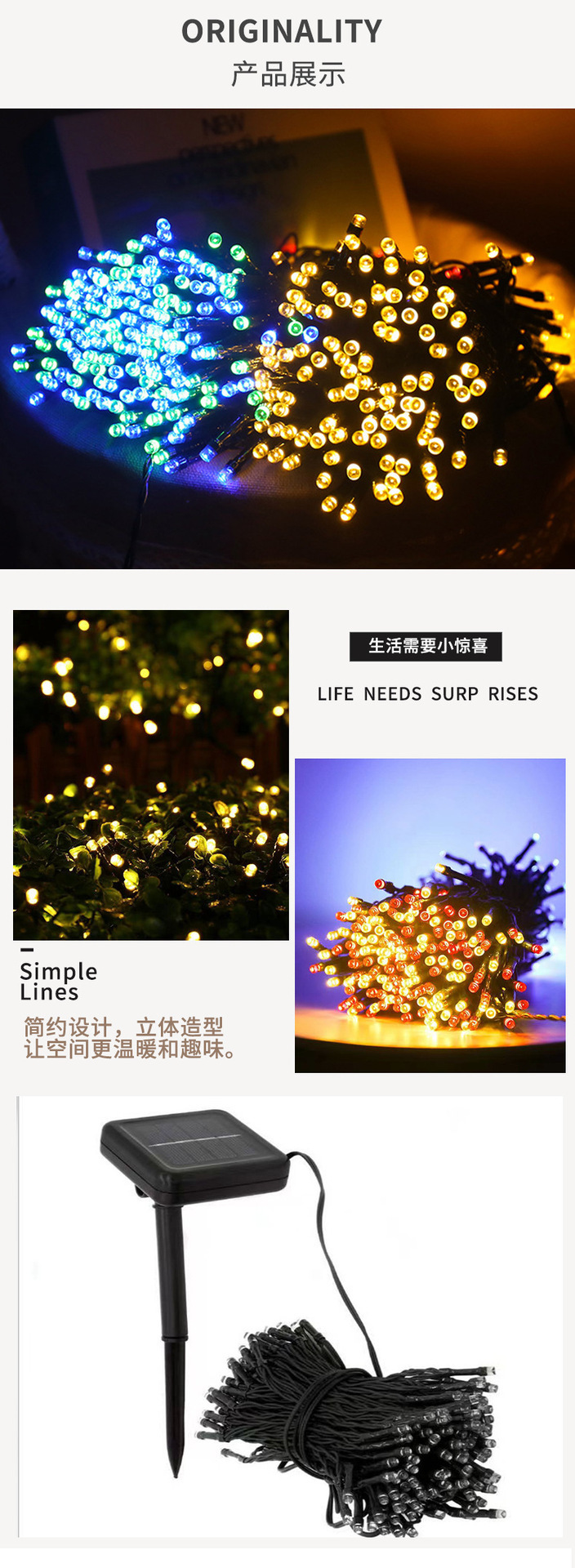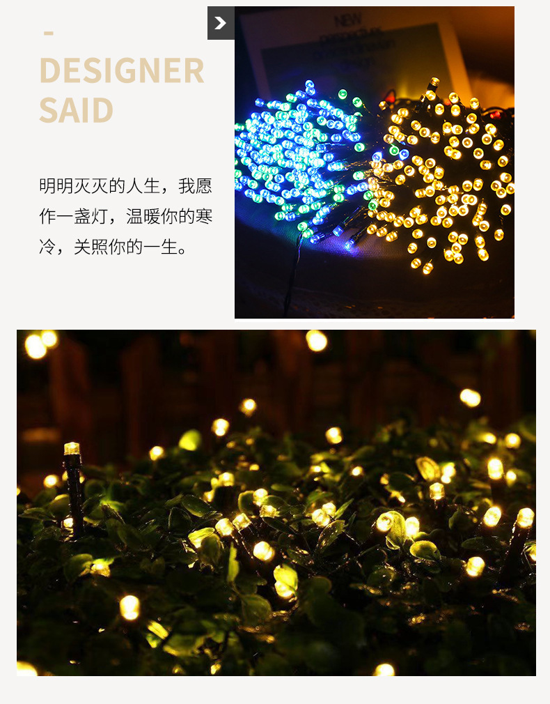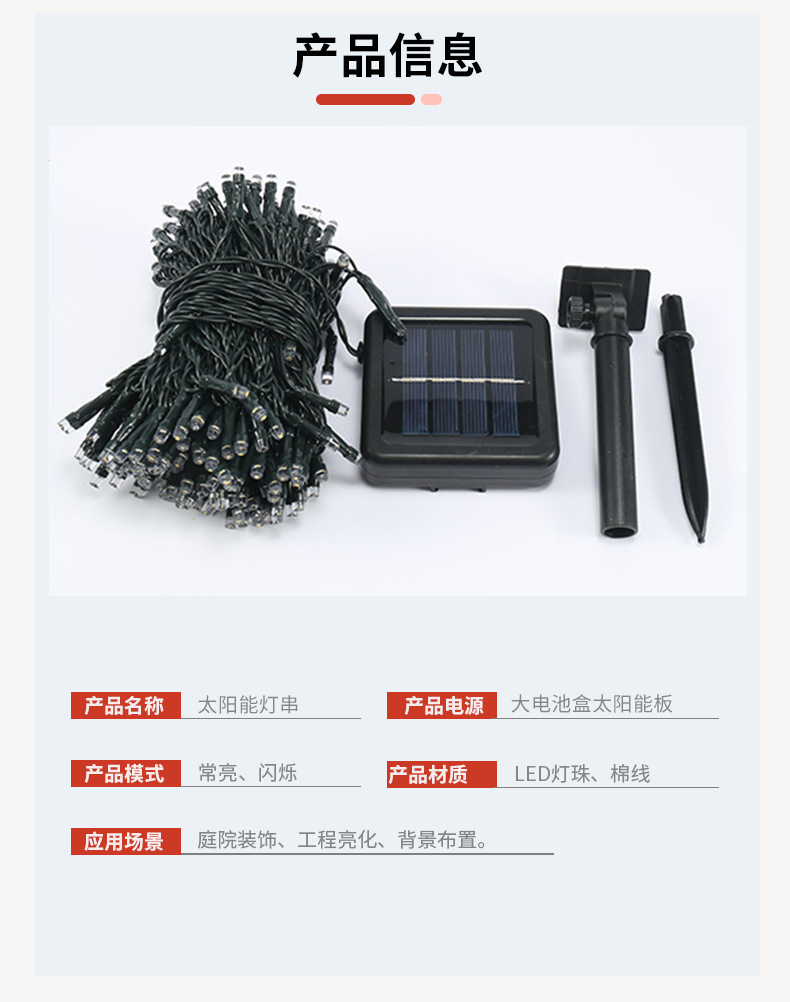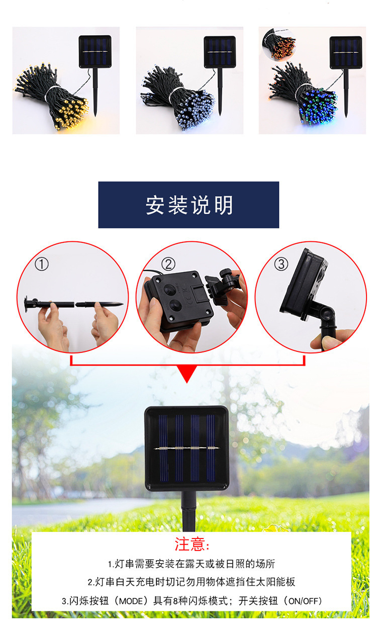 | Color | 5 metros 20 lámparas [función solar 8], 7 metros 50 lámparas [función solar 8], 12 metros 100 lámparas [función solar 8], 22 metros 200 lámparas [función solar 8], 52 metros 500 lámparas [control remoto solar con cable de carga USB], 102 metros 1000 lámparas [control remoto solar con cable de carga USB] |