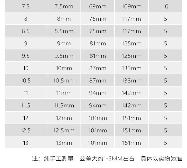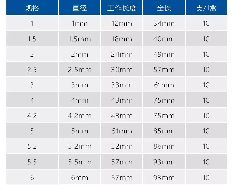 | Especificaciones y modelos | 0.5mm【10支装】,0.6mm【10支装】,0.7mm【10支装】,0.8mm【10支装】,0.9mm【10支装】,1.0mm【10支装】,1.1mm【10支装】,1.2mm【10支装】,1.3mm【10支装】,1.4mm【10支装】,1.5mm【10支装】,1.6mm【10支装】,1.7mm【10支装】,1.8mm【10支装】,1.9mm【10支装】,2.0mm【10支装】,2.1mm【10支装】,2.2mm【10支装】,2.3mm【10支装】,2.4mm【10支装】,2.5mm【10支装】,2.6mm【10支装】,2.7mm【10支装】,2.8mm【10支装】,2.9mm【10支装】,3.0mm【5支装】,3.1mm【5支装】,3.2mm【5支装】,3.3mm【5支装】,3.4mm【5支装】,3.5mm【5支装】,3.6mm【5支装】,3.7mm【5支装】,3.8mm【5支装】,3.9mm【5支装】,4.0mm,4.1mm,4.2mm,4.3mm,4.4mm,4.5mm,4.6mm,4.7mm,4.8mm,4.9mm,5.0mm,5.1mm,5.2mm,5.3mm,5.4mm,5.5mm,5.6mm,5.7mm,5.8mm,5.9mm,6.0mm,6.1mm,6.2mm,6.3mm,6.4mm,6.5mm,6.6mm,6.7mm,6.8mm,6.9mm,7.0mm,7.1mm,7.2mm,7.3mm,7.4mm,7.5mm,7.6mm,7.7mm,7.8mm,7.9mm,8.0mm,8.1mm,8.2mm,8.3mm,8.4mm,8.5mm,8.6mm,8.7mm,8.8mm,8.9mm,9.0mm,9.1mm,9.2mm,9.3mm,9.4mm,9.5mm,9.6mm,9.7mm,9.8mm,9.9mm,10.0mm,10.5mm,11.0mm,11.5mm,12.0mm,12.5mm,13.0mm |