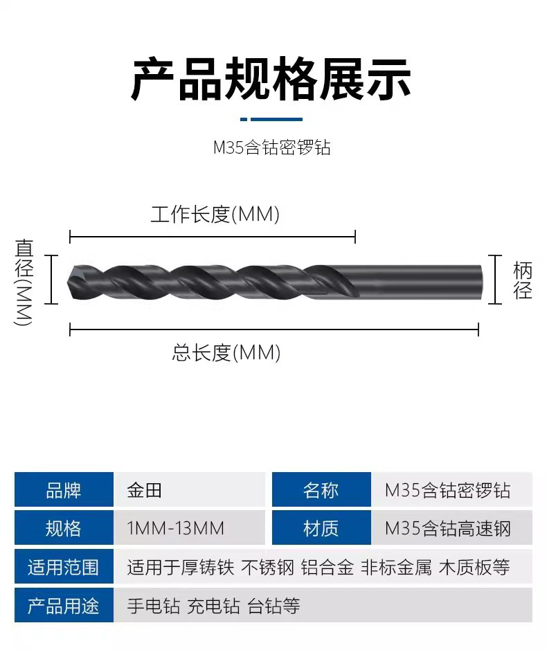 Perforación de acero inoxidable especial de aleación de aluminio con taladro de torsión que contiene cobalto M35 de mango recto de alta dureza para perforación de acero inoxidable