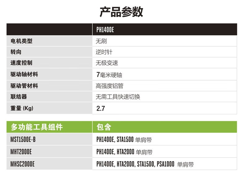 | Especificaciones y modelos | PH1400E cabezal de alimentación de herramientas multicabeza, cabezal de trabajo de sierra de varilla PSA1000, cabezal de alimentación + sierra de varilla - 2.5Ah cargador eléctrico único, cabezal de alimentación + sierra de varilla - 4.0Ah cargador eléctrico único, cabezal de alimentación + sierra de varilla - 5.0Ah cargador eléctrico único, cabezal de alimentación + sierra de césped - 4.0Ah cargador eléctrico único, cabezal de alimentación + sierra de césped - 5.0Ah cargador eléctrico único, cabezal de alimentación + sierra de césped - 4.0Ah cargador eléctrico único, cabezal de trabajo de máquina de setos HTA2000, cabezal de alimentación + máquina de setos - 4.0Ah cargador eléctrico único, Cabeza de potencia + máquina de setos - 5.0Ah carga estándar eléctrica única, cabeza de trabajo de la máquina de corte de riego BCA1200, cabeza de potencia + máquina de corte de riego - 4.0Ah carga estándar eléctrica única, cabeza de potencia + máquina de corte de riego - 5.0Ah carga estándar eléctrica única, varilla de extensión EP7501, conector de mochila BH1001 |