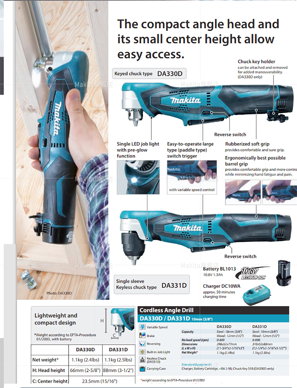 Makida Makida taladro eléctrico angular de carga 10.8V motor de tornillo eléctrico taladro eléctrico herramienta eléctrica DA331DW