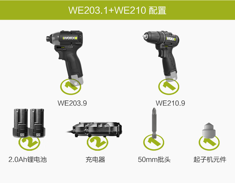 | Modelo | We203 [destornillador de 12v 2.0ah doble electricidad], we203.1 [destornillador de 12v 2.0ah sola electricidad], we203.1 + we210 [destornillador + taladro eléctrico] |