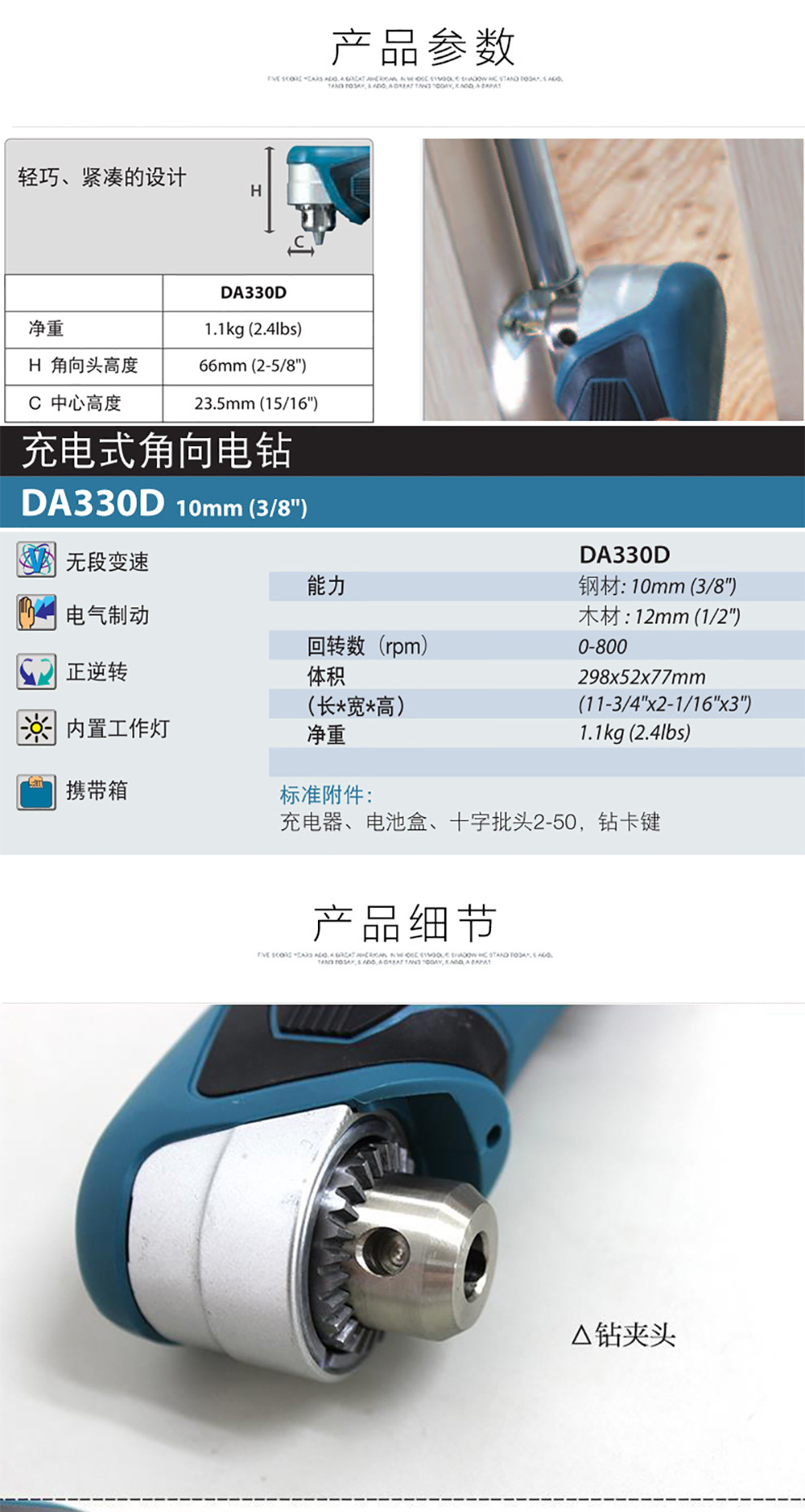 | Modelo | El taladro eléctrico de ángulo da330dwe tiene dos cargas eléctricas y una carga de 1,3 ah, y el taladro eléctrico da330dz no contiene cargador de batería. |