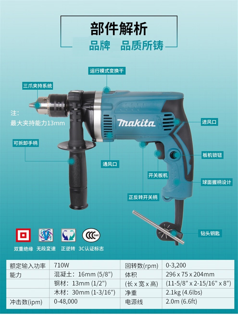 Muchieda Muchieda taladro de impacto 13mm taladro de mano de alta potencia 710 vatios multifunción pequeño martillo HP1630 eléctrico