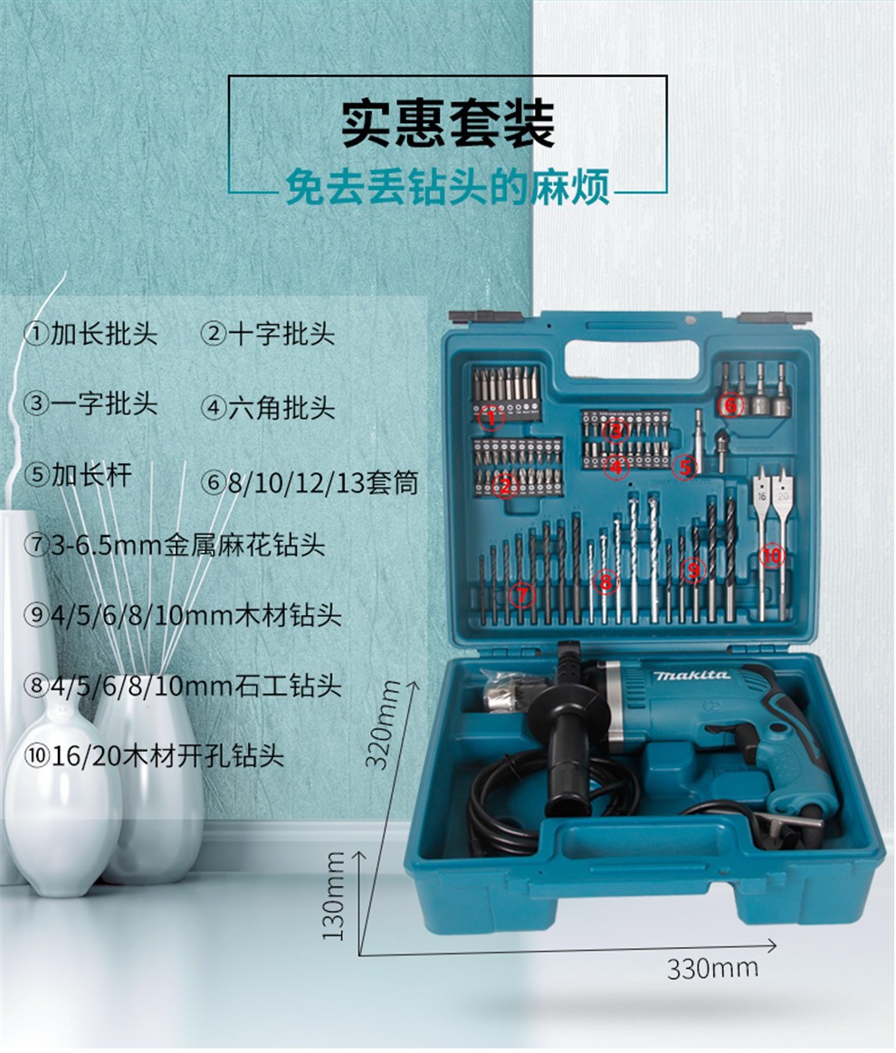 | Modelo | Taladro eléctrico de impacto hp1630 de pastoral (710w), taladro eléctrico de impacto hp1630 + 5 taladros de piedra, taladro eléctrico de impacto hp1630 + 17 conjuntos de taladros, conjunto de taladro de impacto hp1630kx3 de pastoral |