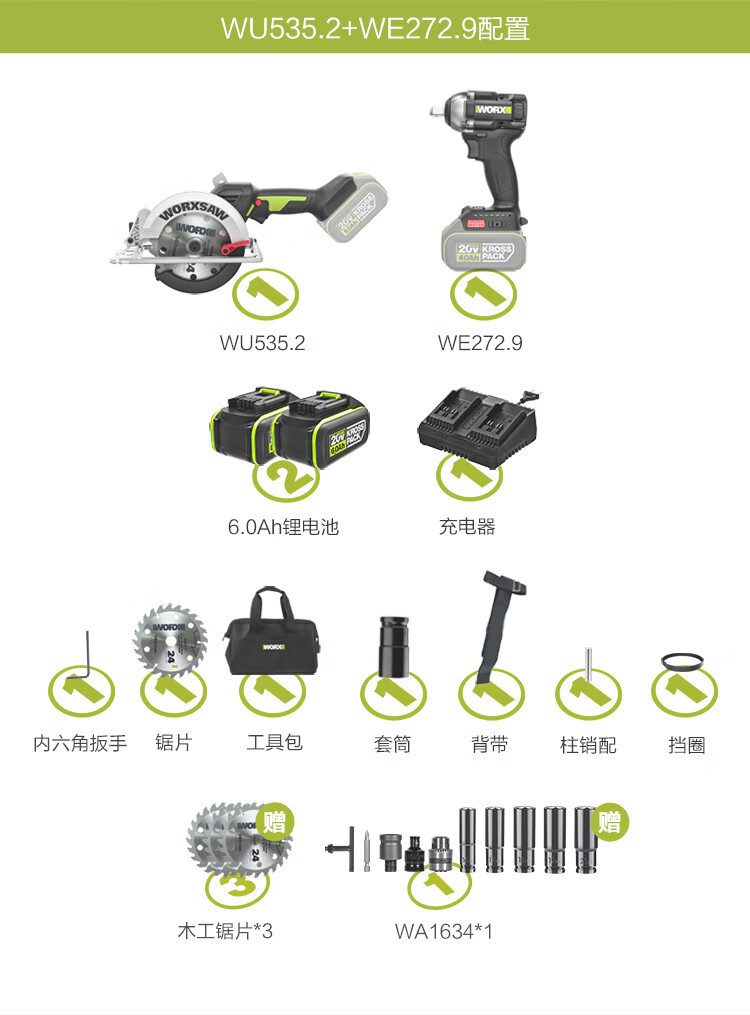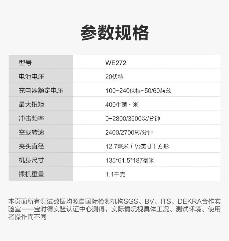 | Modelo | [4.0ah single power] Impact wrench we272, [4.0ah Double power] Impact wrench we272, [5.0ah single power] Impact wrench we272, [5.0ah Double power] Impact wrench we272.1, [6.0ah single power] Impact wrench we272, [5.0ah Double Power trigger saw] wu535 + we272.9, [5.0 Double Power trigger saw] wu535x + we272.9, [4.0ah Double Power trigger molino] we272 + wu806.9, [sin máquina desnuda batería del cargador] we272.9, [4.0ah sierra eléctrica doble] we272 + wu535.9, [4.0 sierra eléctrica doble] we272 + wu535x.9 |