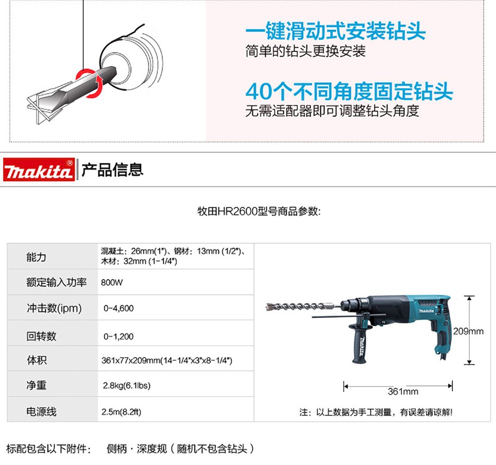 | Modelo | Hr2630 taladro estándar de 26 mm de tres funciones, taladro estándar de martillo eléctrico de dos funciones hr2600, paquete multifuncional de martillo eléctrico de dos funciones hr2600 |