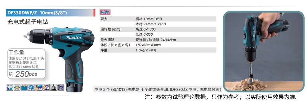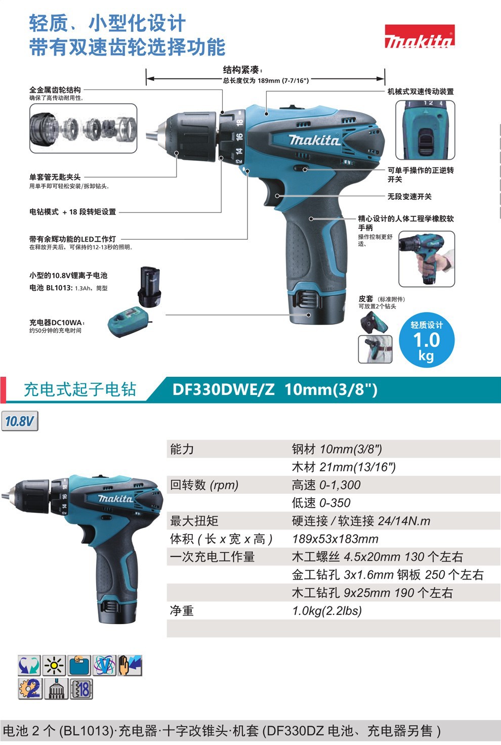 | Modelo | Df330dw (una electricidad, una carga 1.3ah), df330dwe (dos electricidad, una carga 1.3ah), df330dz (el Metal desnudo no contiene cargador de batería) |