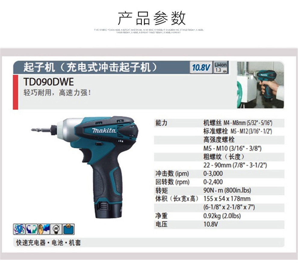 | Modelo | Td090dwe (dos cargas, una carga, 1,3ah + luz desnuda, td090dwe (dos cargas, una carga, 1,3ah), td090dz desnudo sin cargador de batería, td090dwe dos cargas, una carga + taladro, td090dwe dos cargas, una carga + 18 cabezas de lote, td090dwe dos cargas, una carga + 28 cabezas de lote, td090dwe dos cargas, una carga + 31 cabezas de lote, td090dwe dos cargas, una carga + 5 brocas |