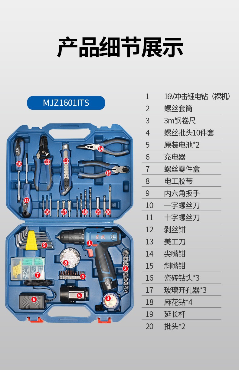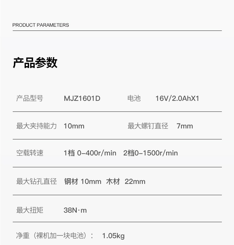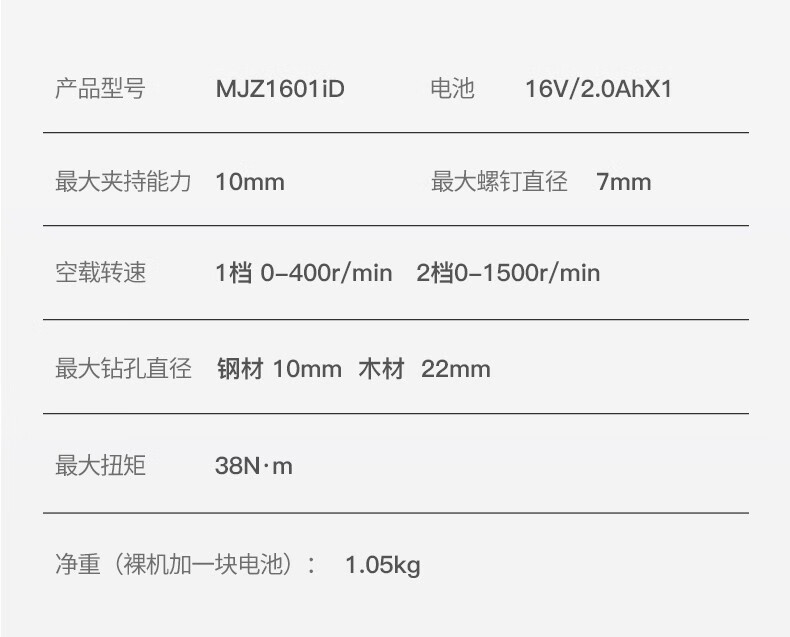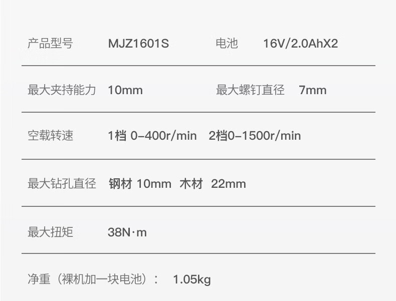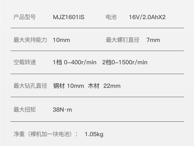 | Modelo | MJZ1601D 16V eléctrico único, MJZ1601S 16V eléctrico dual, MJZ1601iD 16V eléctrico único, MJZ1601iS 16V eléctrico dual, MJZ1601TS 16V eléctrico dual, WJZ1601iTS 16V eléctrico dual, 1601Z metal desnudo sin carga |