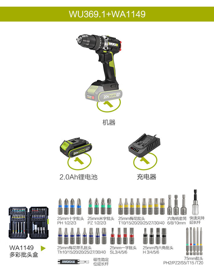 | Modelo | WU369 [perforación de impacto eléctrico doble 60Nm2.0Ah], WU369.9 [perforación de impacto eléctrico único 60Nm2.0Ah], WU369 [perforación de impacto eléctrico único 60Nm5.0Ah], WU182 [perforación de impacto eléctrico doble 60Nm2.0Ah], WU182.1 [perforación de impacto eléctrico único 60Nm2.0Ah], WU182.9 [perforación de impacto eléctrico único 60Nm4.0Ah], WU369.1 + WA1149 [Arco Iris Beatle] |