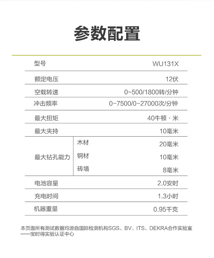 | Modelo | WU131X.1 [perforación de perforación eléctrica única 2.0Ah], WU131X [perforación de perforación eléctrica doble 2.0Ah], WU130X [perforación eléctrica doble 2.Ah], WU130X.1 [perforación eléctrica única 2.0Ah], WU130X.9 [metal desnudo sin cargador de batería], WU131X.5 [conjunto de accesorios eléctricos de 106 piezas], WU129 [perforación eléctrica de motor eléctrico doble 2.0Ah], WU129.1 [perforación eléctrica de motor eléctrico único 2.0Ah], WU131X.1 + WA1621 conjunto de accesorios de perforación eléctrica, WU131X + WA1623 conjunto de accesorios de taladro de impacto, WE210 [taladro eléctrico único de 2.0Ah] |