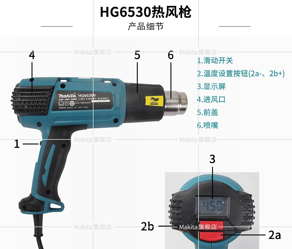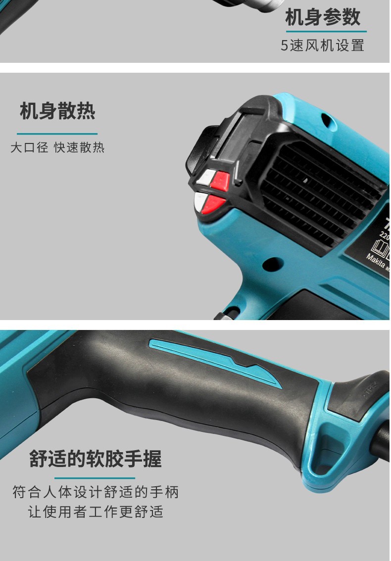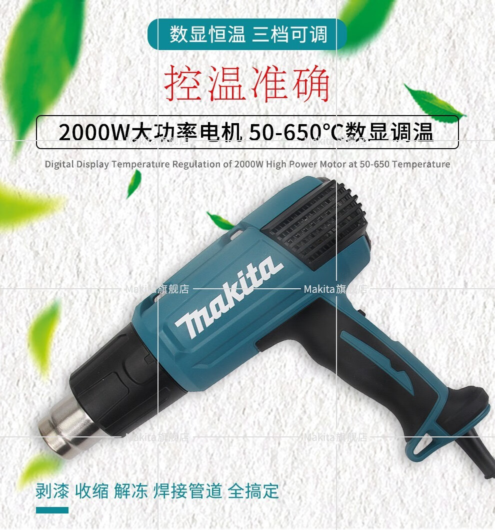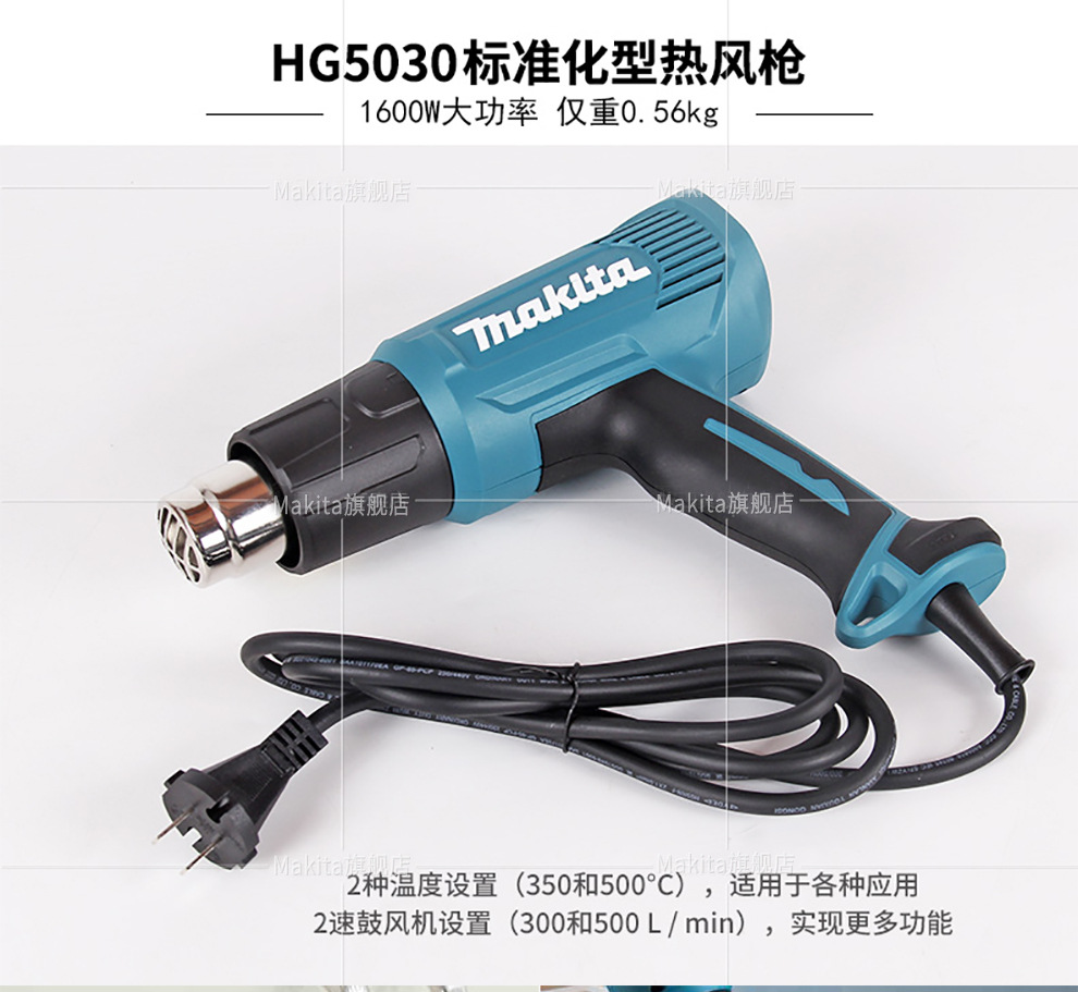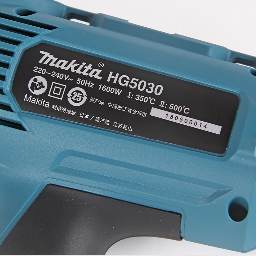 Modelo de especificaciónMutian HG5030K pistola de aire caliente 1600W,Pistola de aire caliente Makita HG5012K 1600W,HG6531CK pistola de aire caliente con pantalla digital 2000W,Mutian HG6530VK pistola de aire caliente 2000W