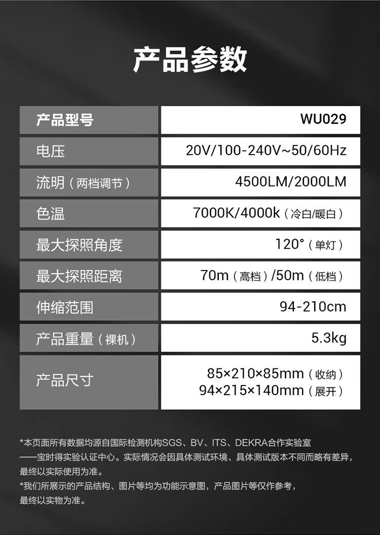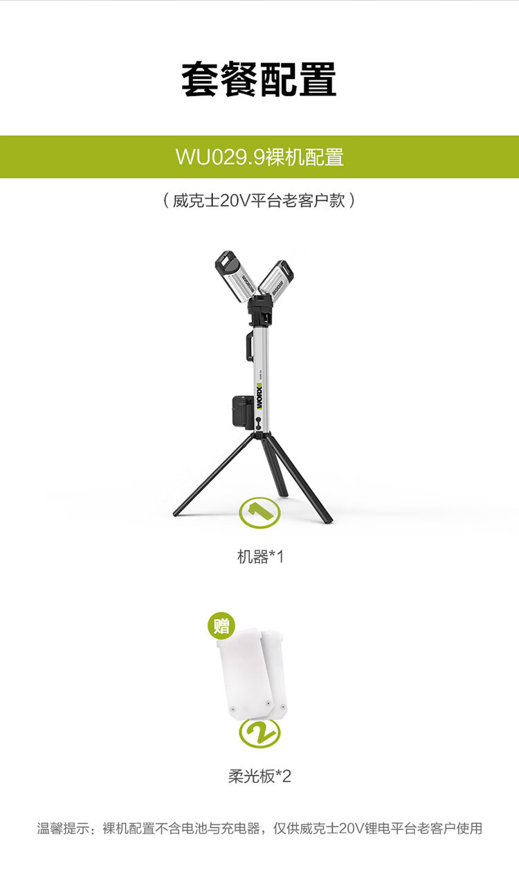 | Especificaciones | [Carga de batería de metal desnudo] WU029.9, [Carga de metal desnudo + adaptador] WU029.9 + WA0971, [Carga eléctrica única de 4.0Ah] Lámpara de soporte de 20V WU029 |