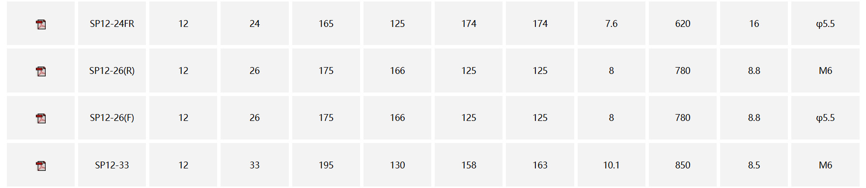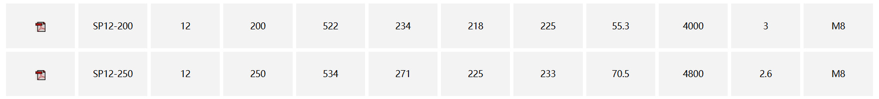 | Modelo | SSP12-7,SSP12-12,SSP12-18,SP12-24FR,SP12-26,SP12-33,SP12-38,SP12-40,SP12-50,SP12-65,SP12-80,SP12-100,SP12-120,SP12-150,SP12-200 |