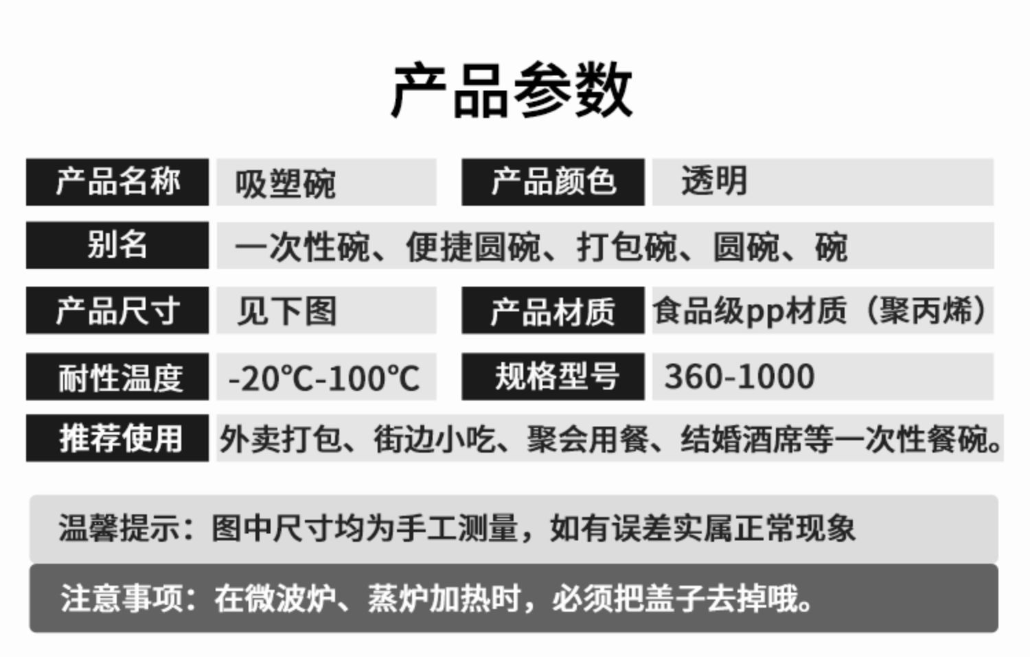 | Color | 360碗型50只【不带盖】☆,360碗型100只【不带盖】☆,360碗型300只【不带盖】☆,【加厚型】360碗型300只 不带盖☆,360碗型600只【不带盖】☆,360碗型50套【带盖】☆,360碗型200套【带盖】☆,360碗型100套【带盖】☆,360碗型300套【带盖】☆,【加厚型】360碗型300套 带盖☆,360碗型600套【带盖】☆,500碗型50只【不带盖】☆,500碗型100只【不带盖】☆,500碗型300只【不带盖】☆,【加厚型】500碗型300只 不带盖☆,500碗型600只【不带盖】☆,500碗型50套【带盖】☆,500碗型100套【带盖】☆,500碗型200套【带盖】☆,500碗型300套【带盖】☆,【加厚型】500碗型300套 带盖☆,500碗型600套【带盖】☆,700碗型50只【不带盖】☆,700碗型100只【不带盖】☆,700碗型200只【不带盖】☆,700碗型300只【不带盖】☆,700碗型600只【不带盖】☆,【加厚型】700碗型300只 不带盖☆,700碗型50套【带盖】☆,700碗型100套【带盖】☆,700碗型200套【带盖】☆,700碗型300套【带盖】☆,【加厚型】700碗型300套 带盖☆,700碗型600套【带盖】☆,850碗型50只【不带盖】☆,850碗型100只【不带盖】☆,850碗型200只【不带盖】☆,850碗型300只【不带盖】☆,850碗型600只【不带盖】☆,850碗型50套【带盖】☆,850碗型100套【带盖】☆,850碗型300套【带盖】☆,850碗型600套【带盖】☆,850碗型200套【带盖】☆,999碗型50只【不带盖】☆,999碗型200只【不带盖】☆,999碗型600只【不带盖】☆,999碗型50套【带盖】☆,999碗型200套【带盖】☆,999碗型600套【带盖】☆,1000碗型50只【不带盖】☆,1000碗型300只【不带盖】☆,1000碗型50套【带盖】☆,1000碗型300套【带盖】☆,120吸塑盖*100个☆,142吸塑盖*100个☆ |