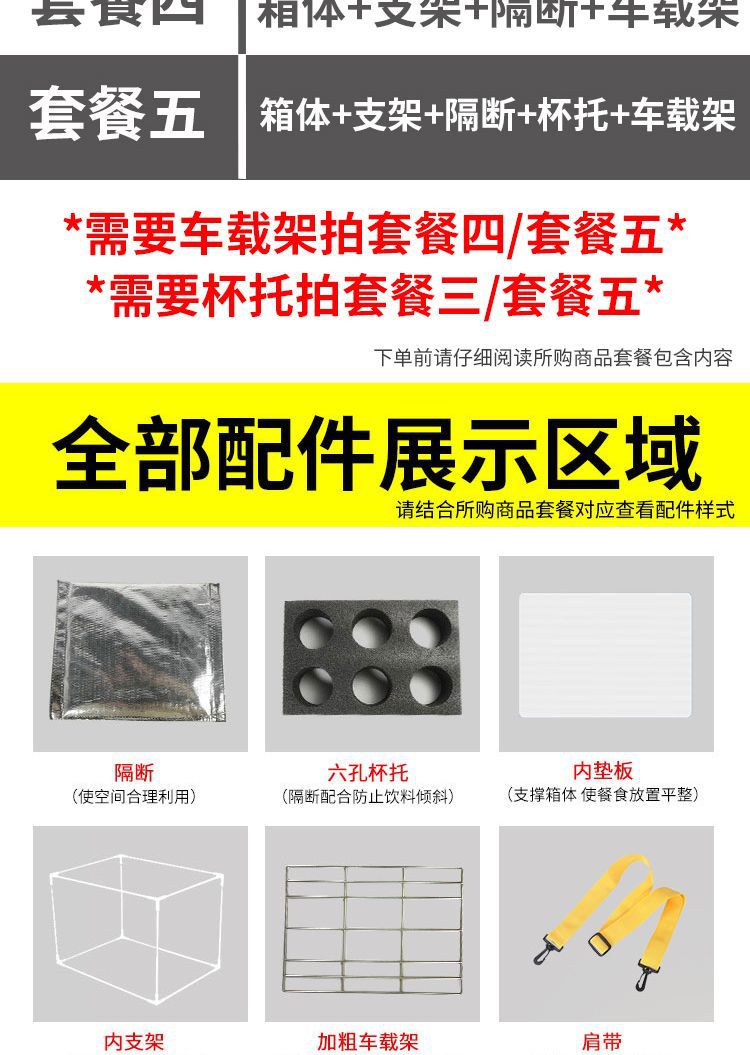 | Color | Bolsa de mano de 12 litros ✓, paquete 1: soporte interno + placa de respaldo ✓, paquete 2: soporte + placa de respaldo + partición ✓, paquete 3: soporte + placa de respaldo + partición + portavasos ✓, paquete 4: soporte + placa de respaldo + partición + marco de automóvil ✓, paquete 5: soporte + placa de respaldo + partición + portavasos + marco ✓ |