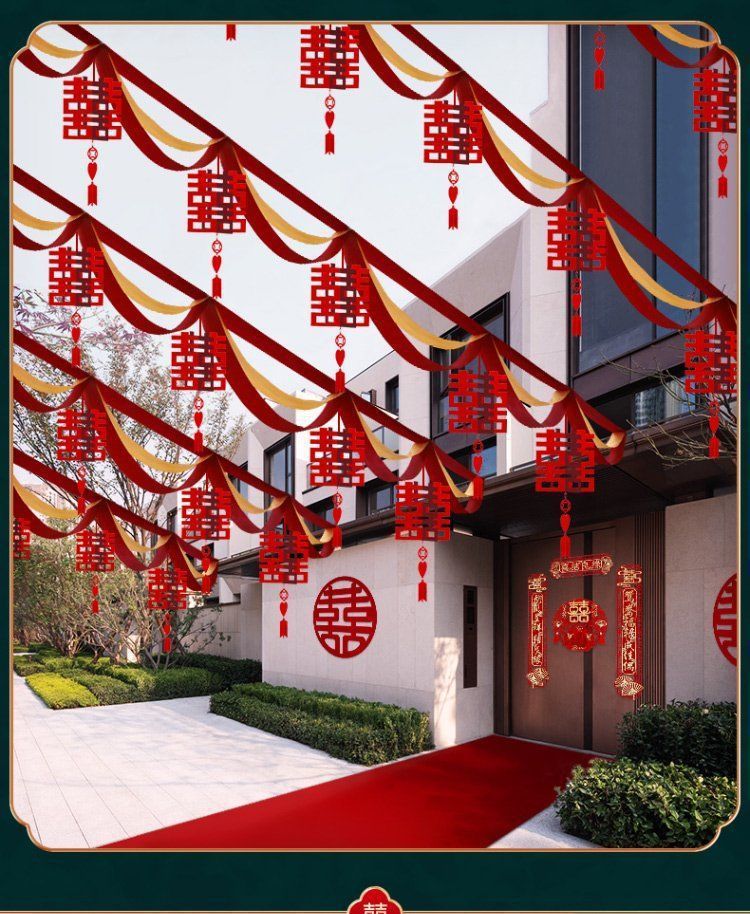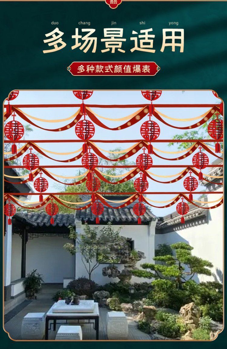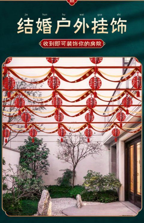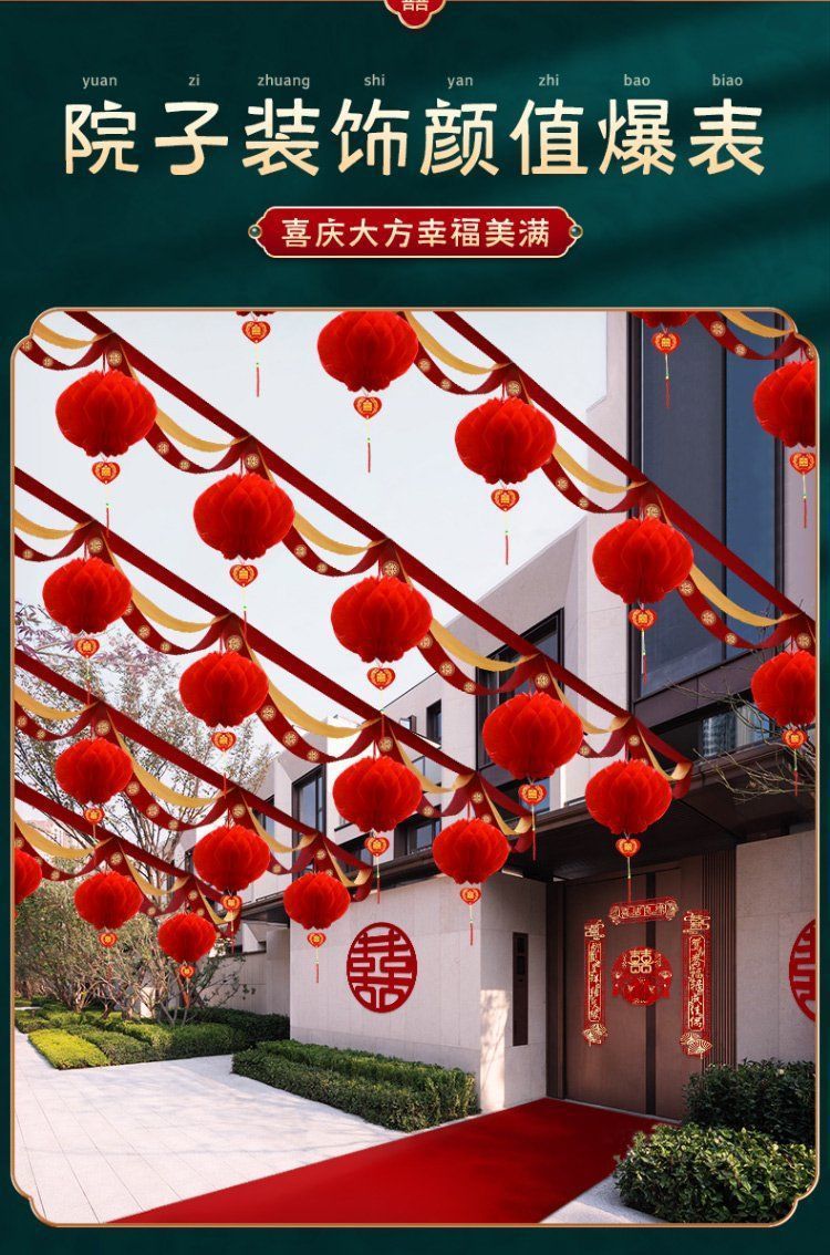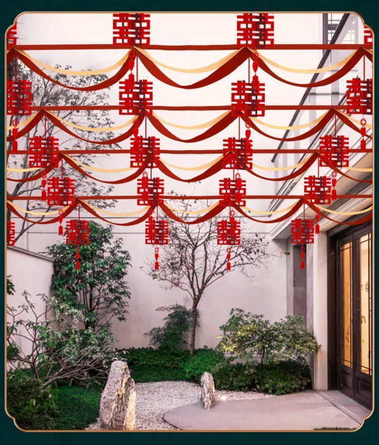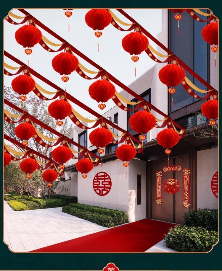 Decoración de bodas en el patio rural tira de flores al aire libre escena de boda cinta de color linterna escena de diseño de suministros de boda