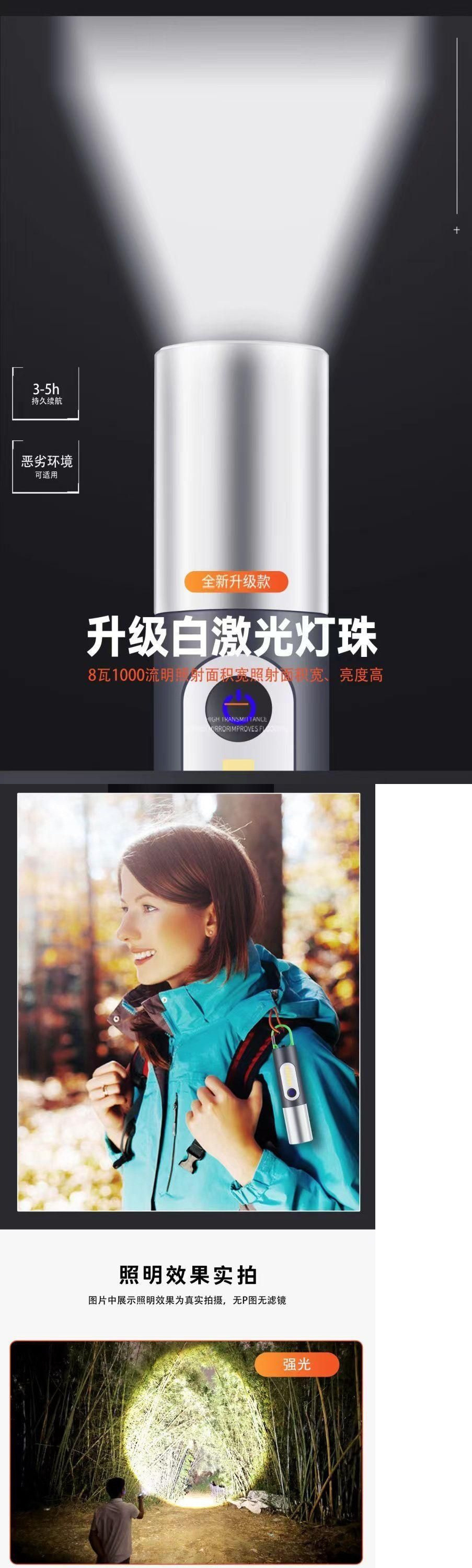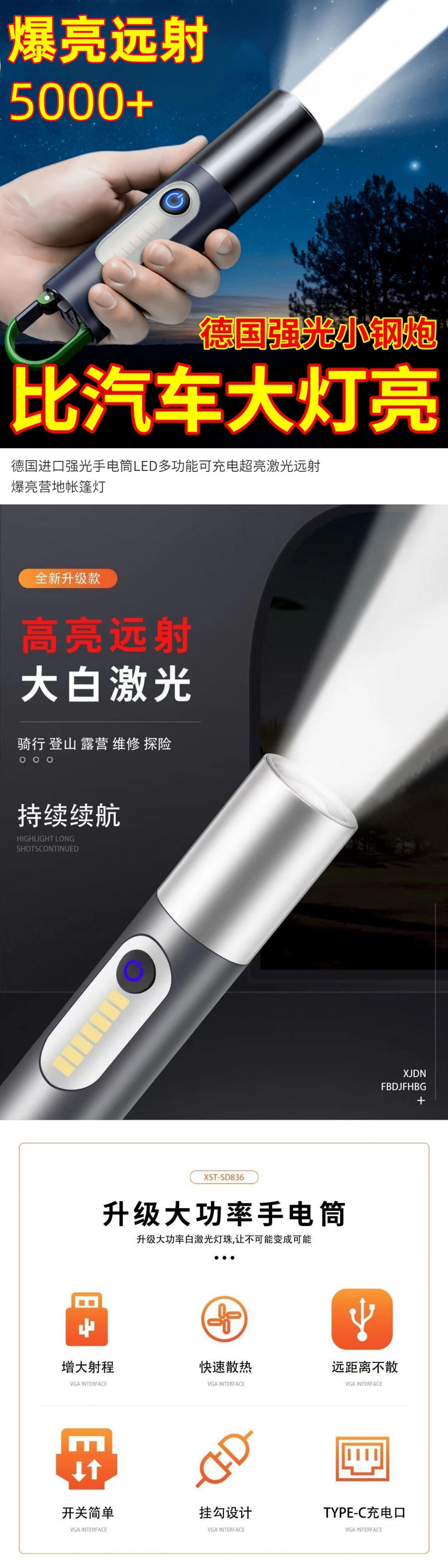 Antorcha de luz alta importada de Alemania LED multifuncional recargable láser ultra brillante de largo alcance explosión campamento luz de tienda de campaña