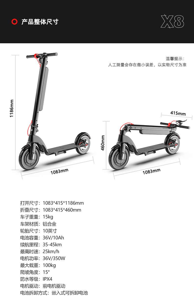 | Color | Negro X8{10 pulgadas/350W/36V 10AH/resistencia 30-40 kilómetros} |